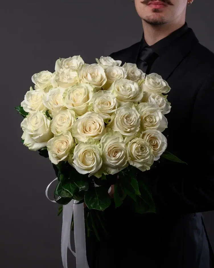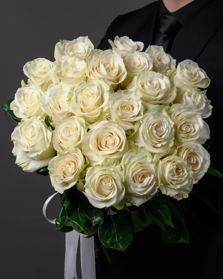 В языке цветов 25 белых роз — это симфония безупречной любви, высшая форма признания и преданности. Это число говорит: «Ты — моя единственная и навсегда», «Наша связь нерушима и вечна».