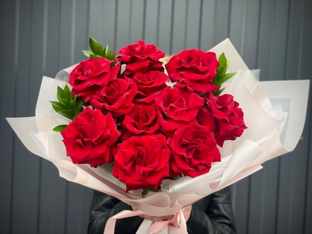 Букет из роз Софи Лорен. В состав букета входит: - Розы Эксплорер 50 см 11 шт - Рускус - Пленка рулон - Лента атласная - Лента пластик - Кризал