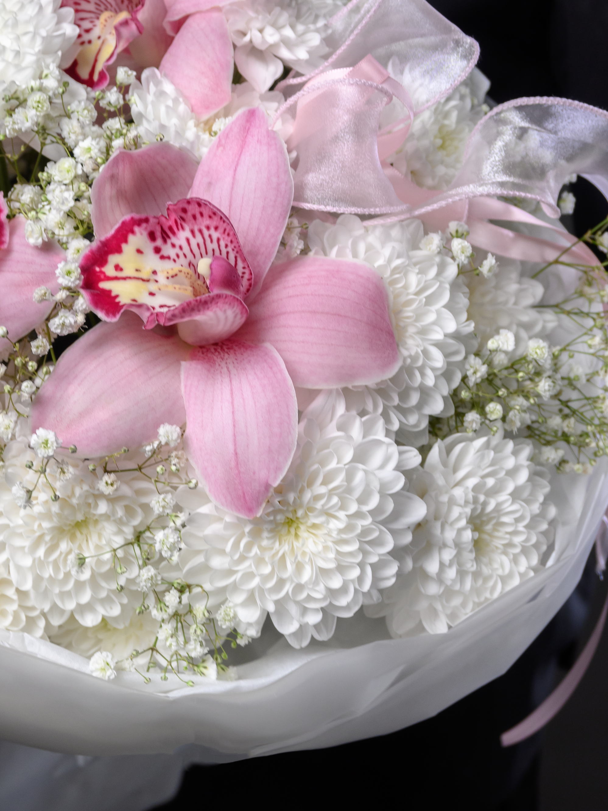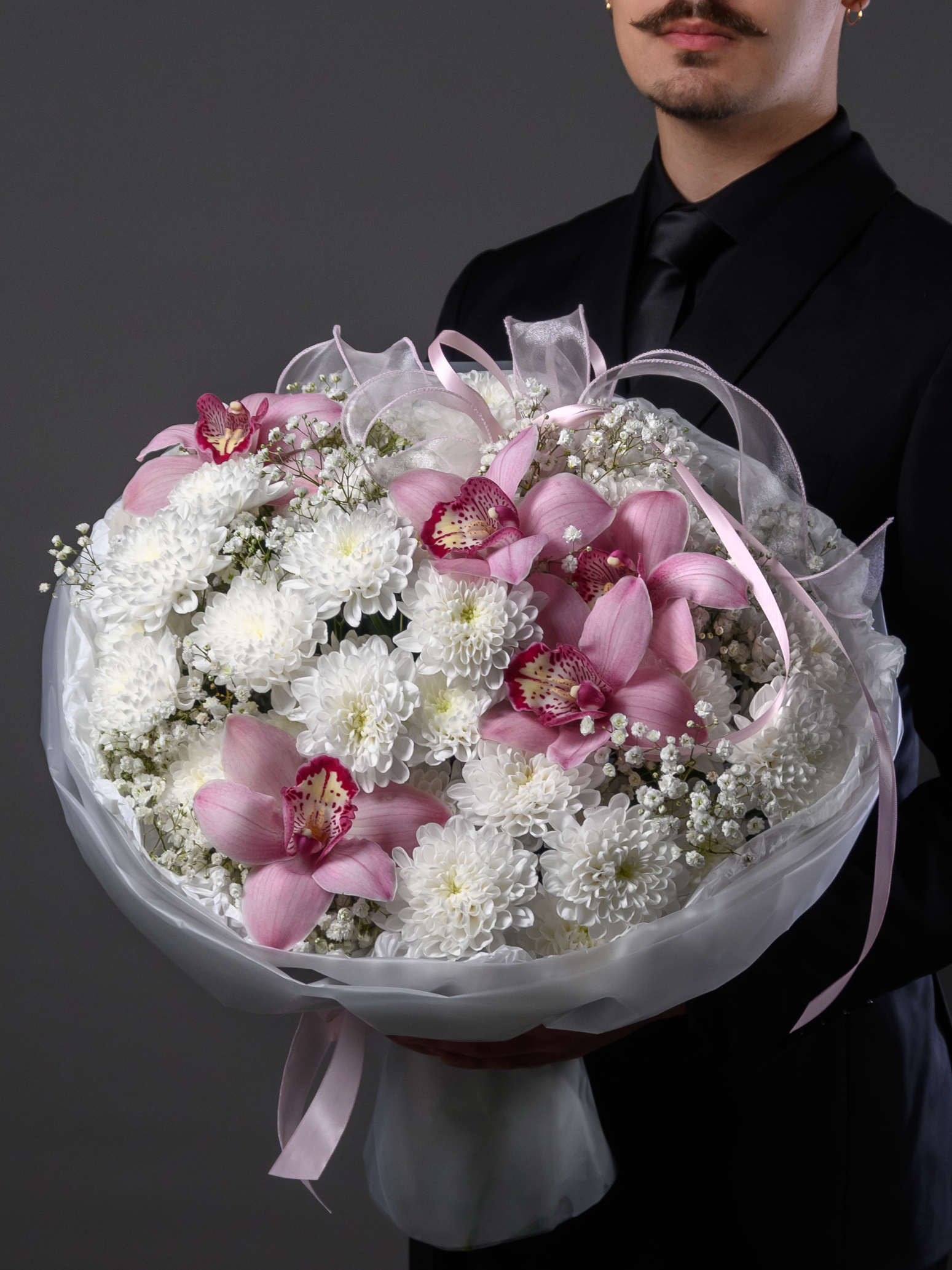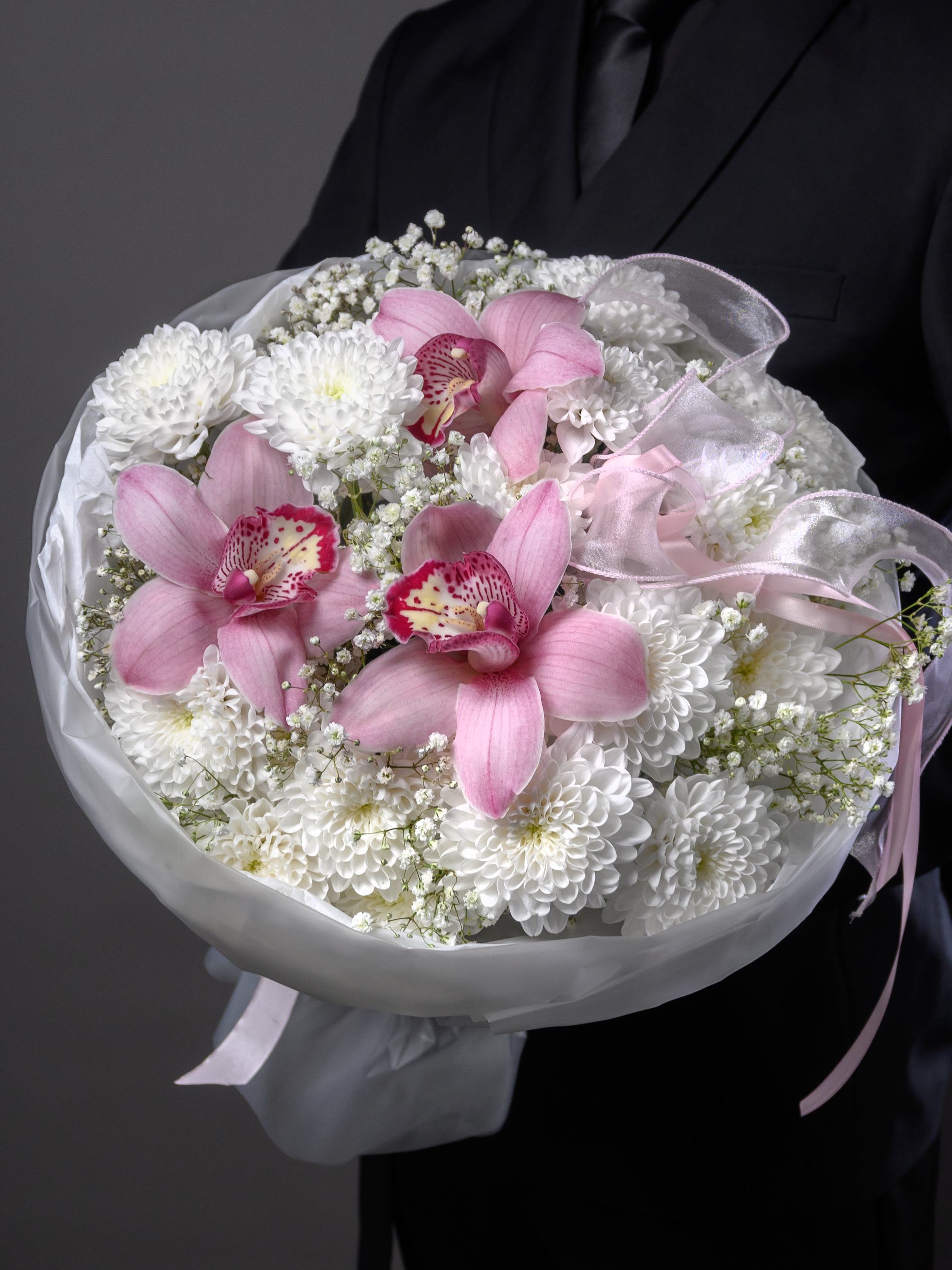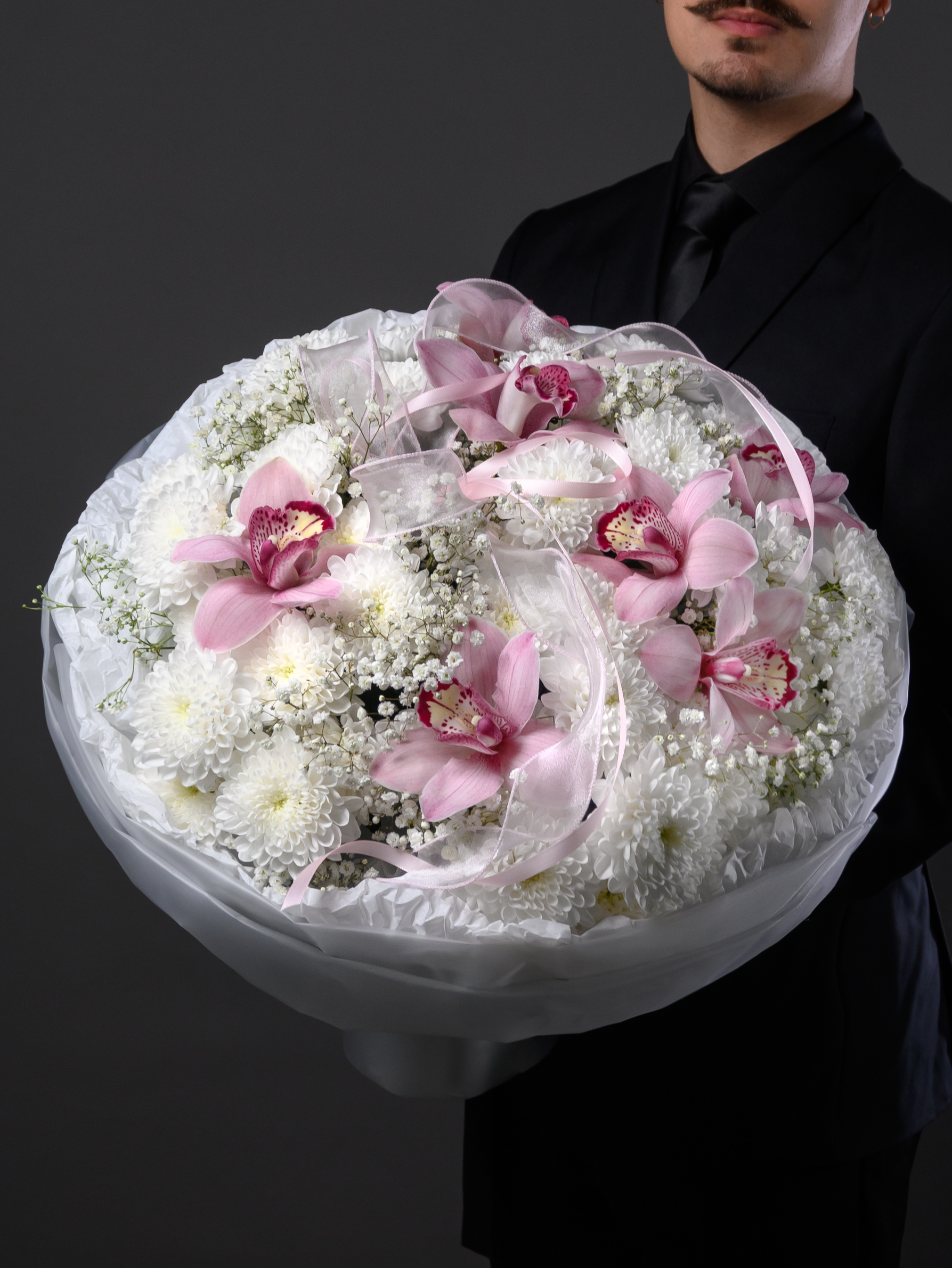 «Королева сердца» — роскошный букет, созданный выразить самые теплые чувства! Атласные ленты подчеркивают изысканность композиции, а пластиковые ленты обеспечивают долговечность хризантемам и гипсофиле. Гигантская хризантема и пышная кустовая белая хризантема придают букету особую элегантность. Три размера (М – 30-35см; L – 40–45см; XL – 50–55см) позволяют выбрать идеальный вариант для вашего случая.
