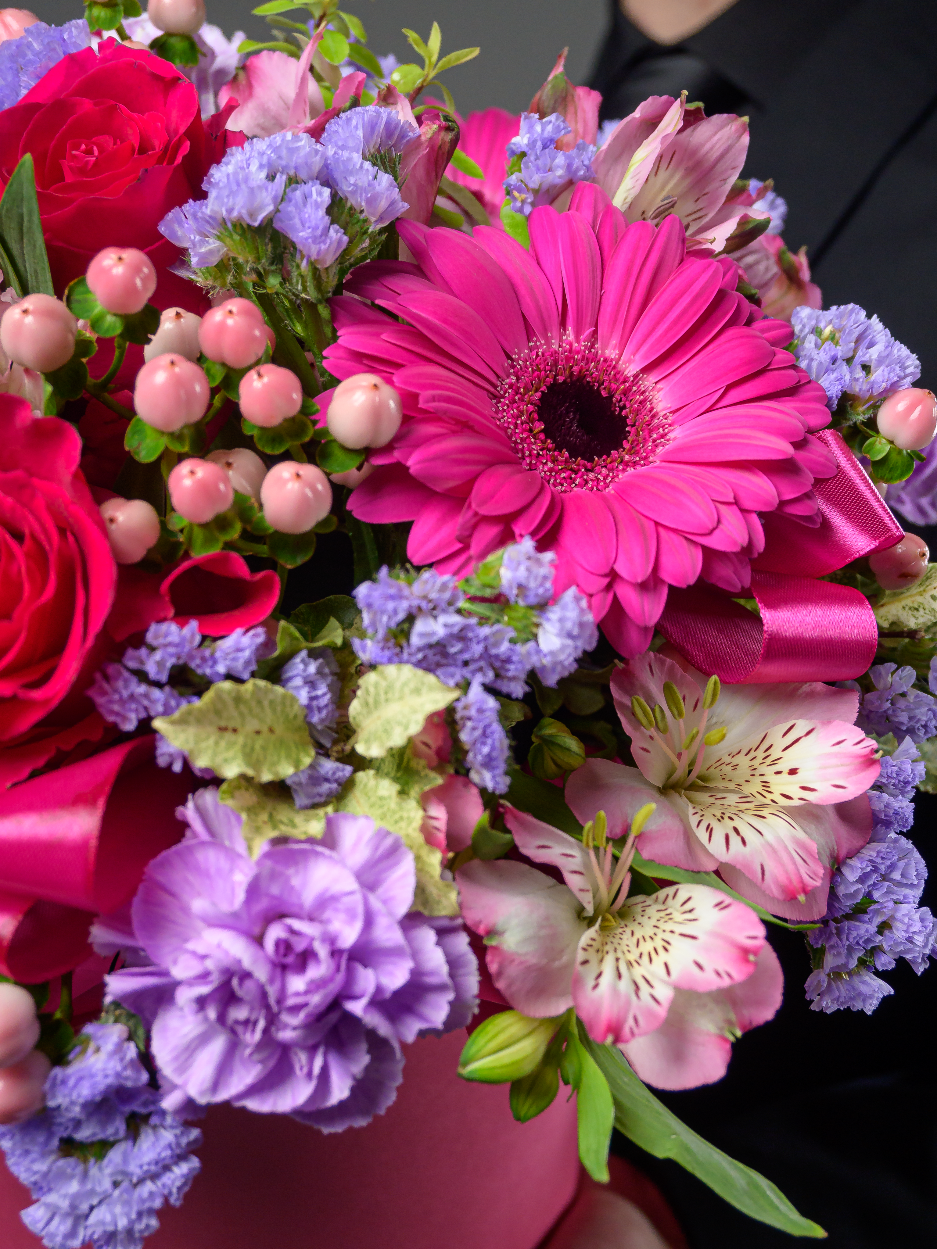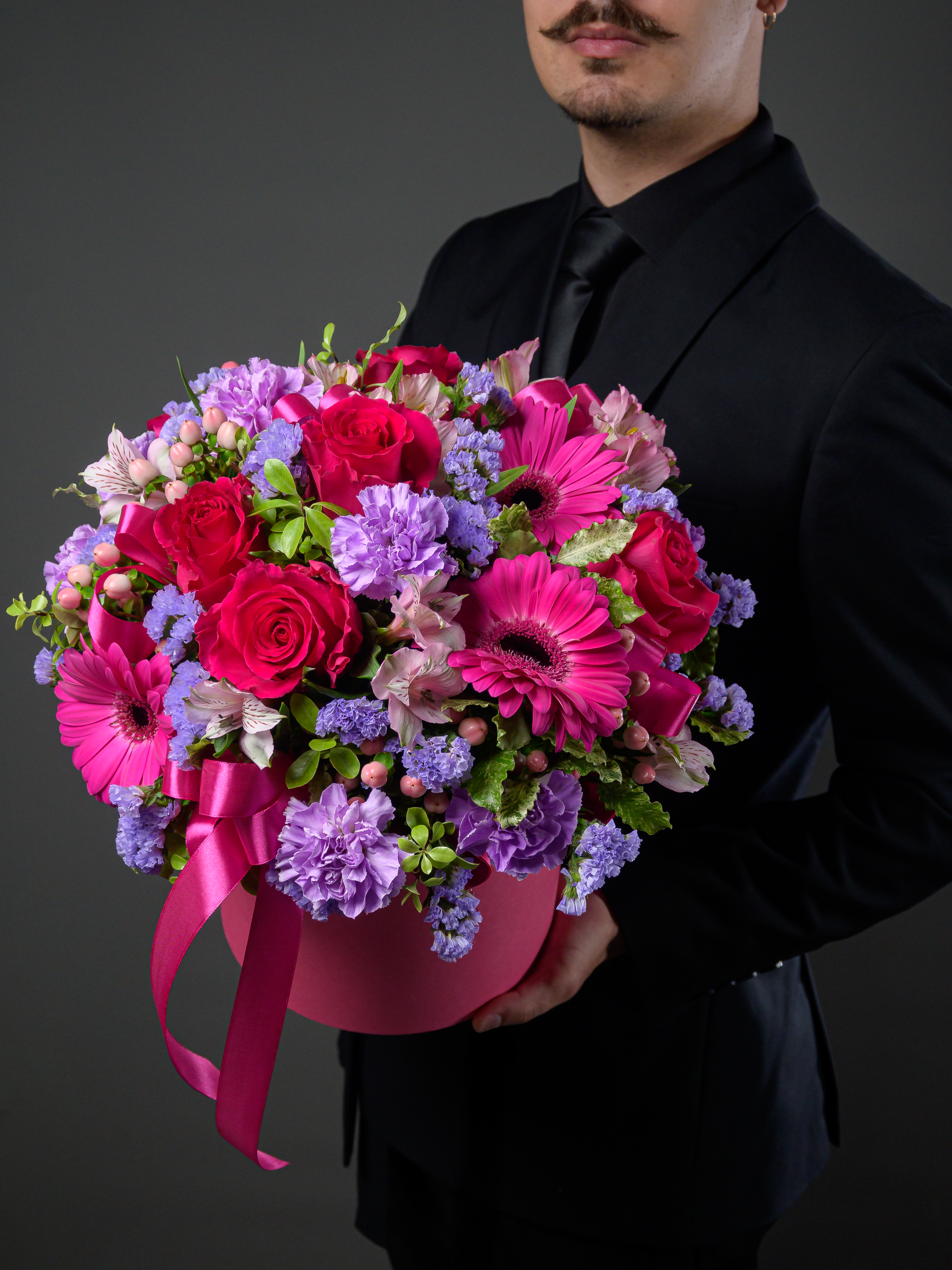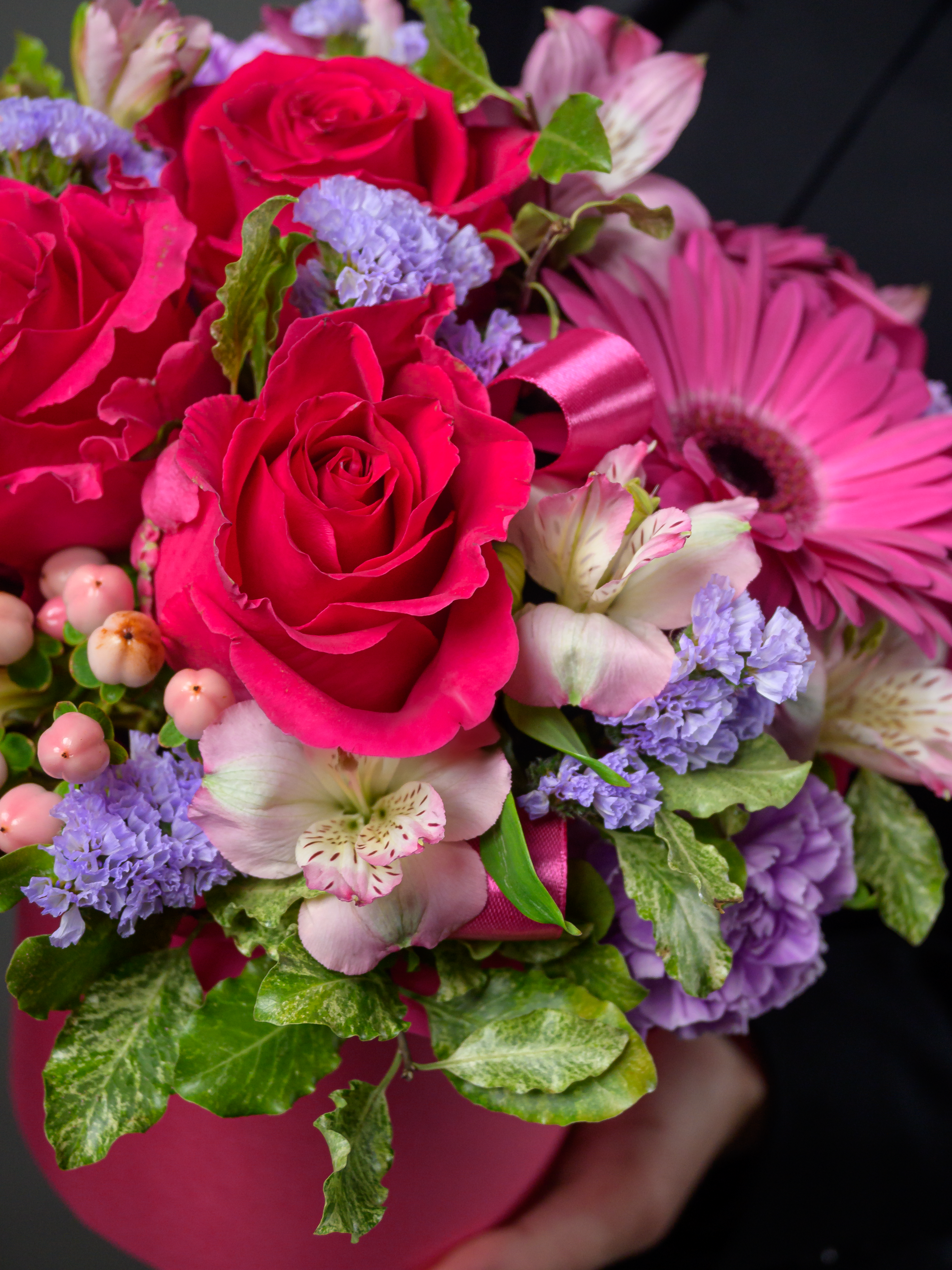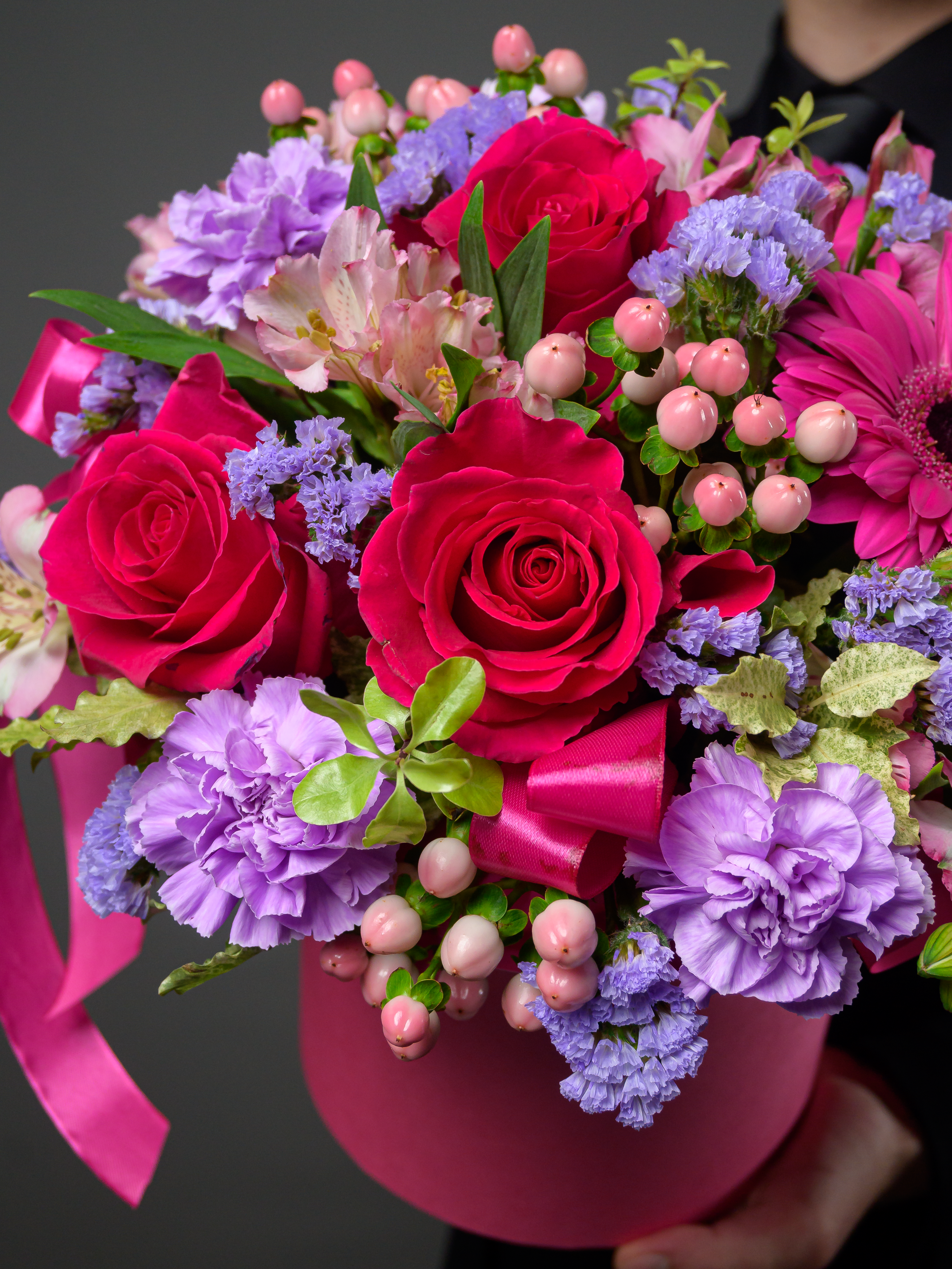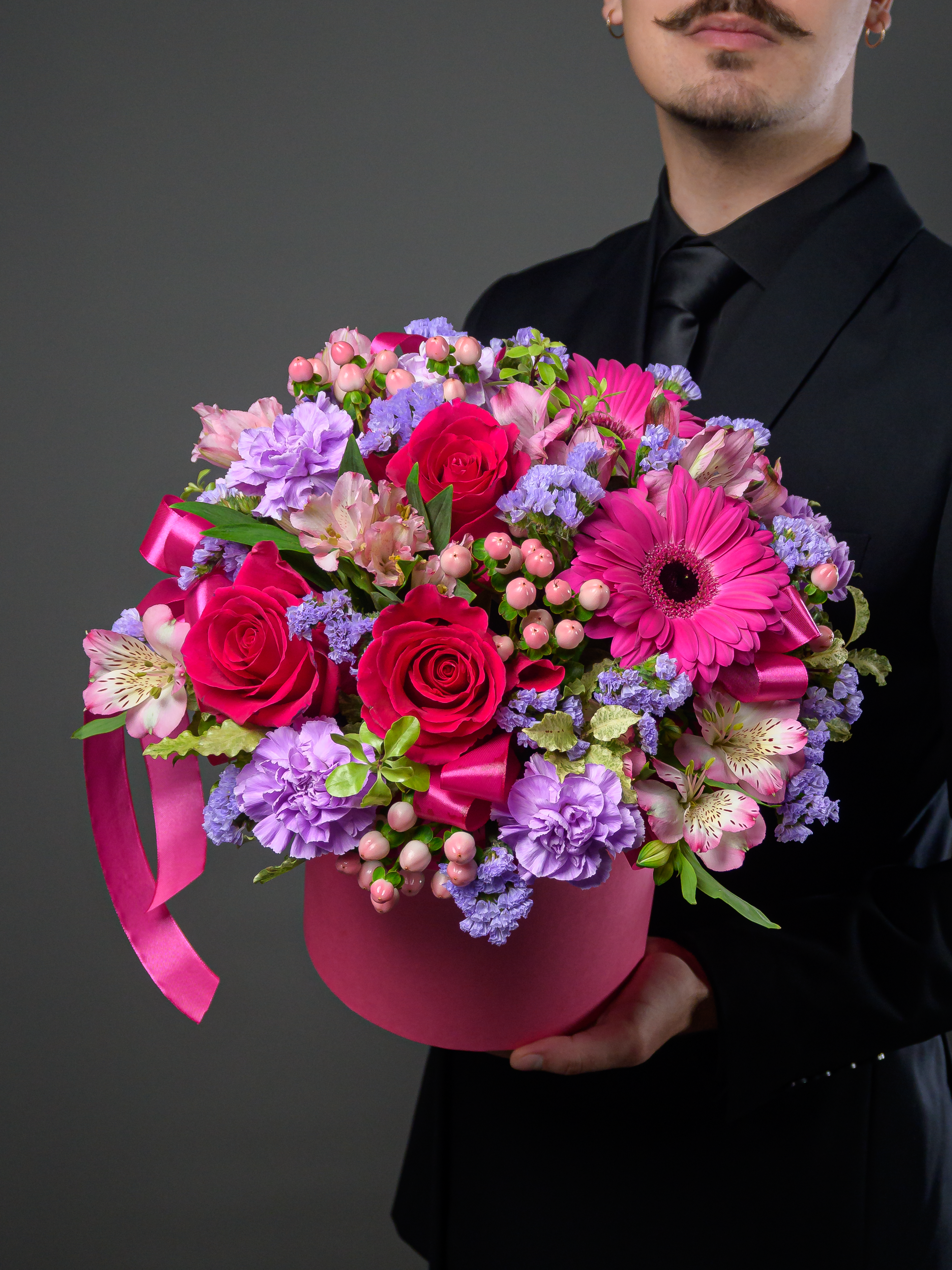 Пленка рулон, Лента атласная, Гиперикум, Альстромерия, Роза одноголовая микс, Гербера аква микс, Статица, Питоспорум, Оазис, Коробка, Гвоздика одноголовая лунная