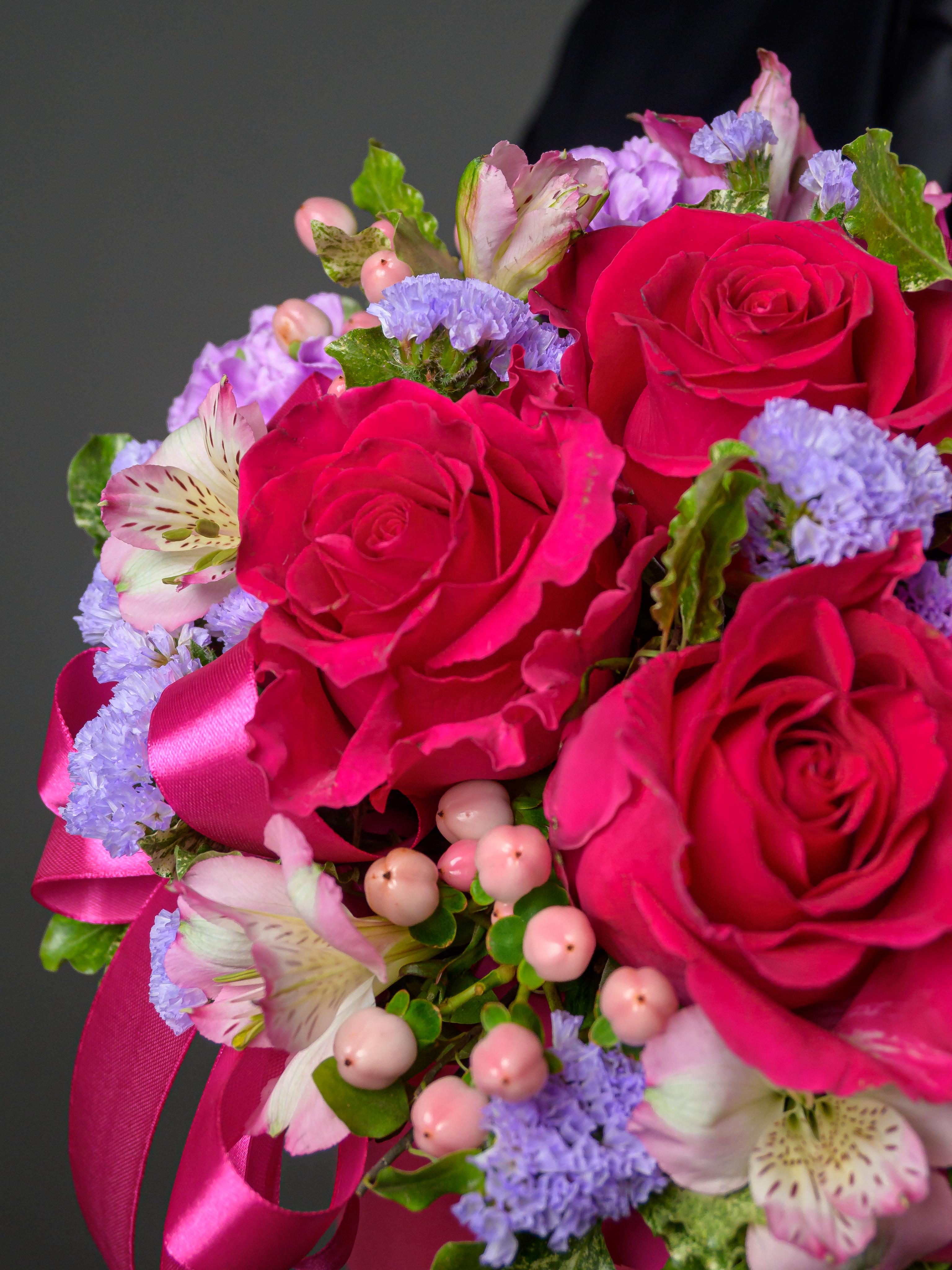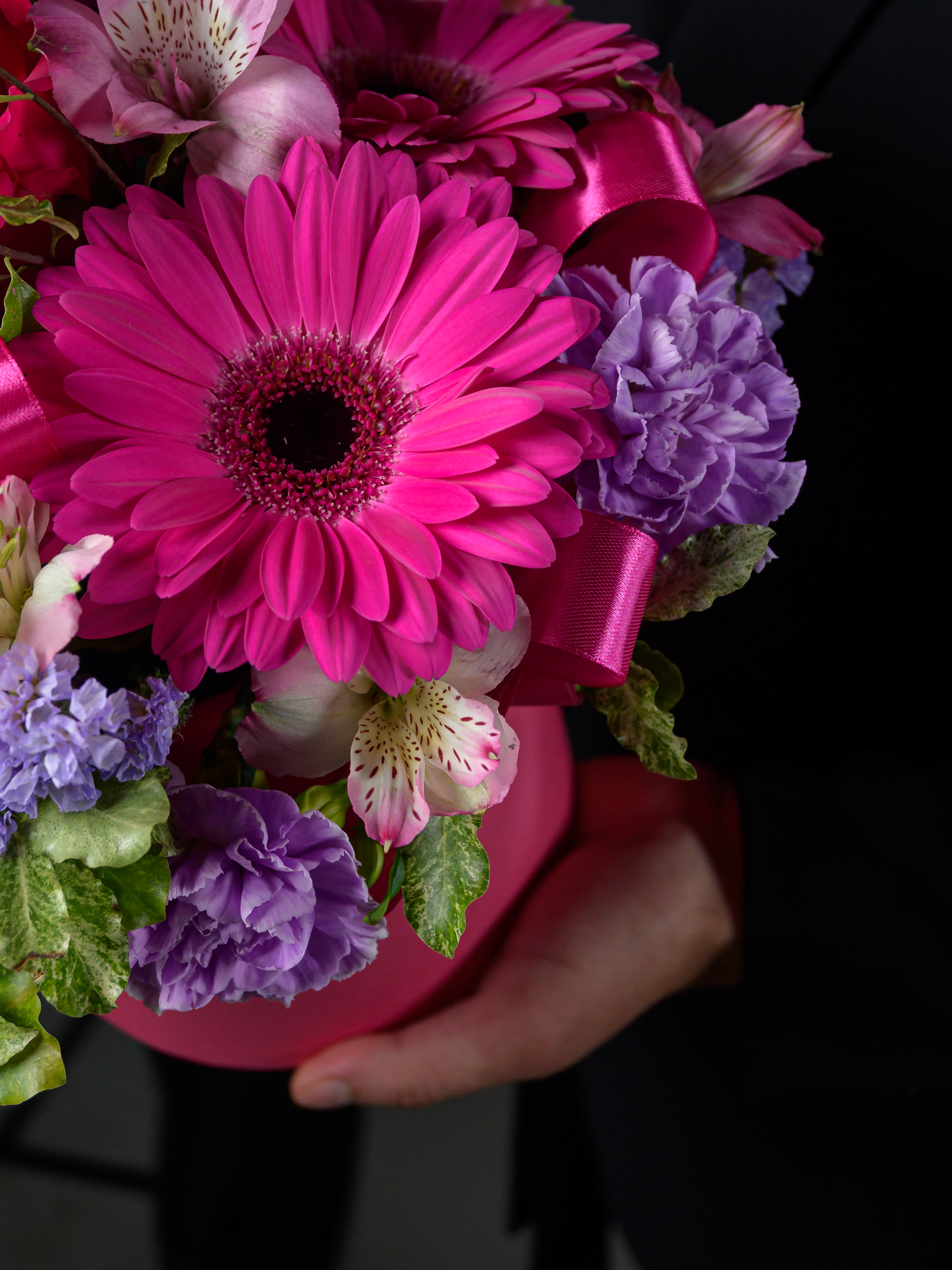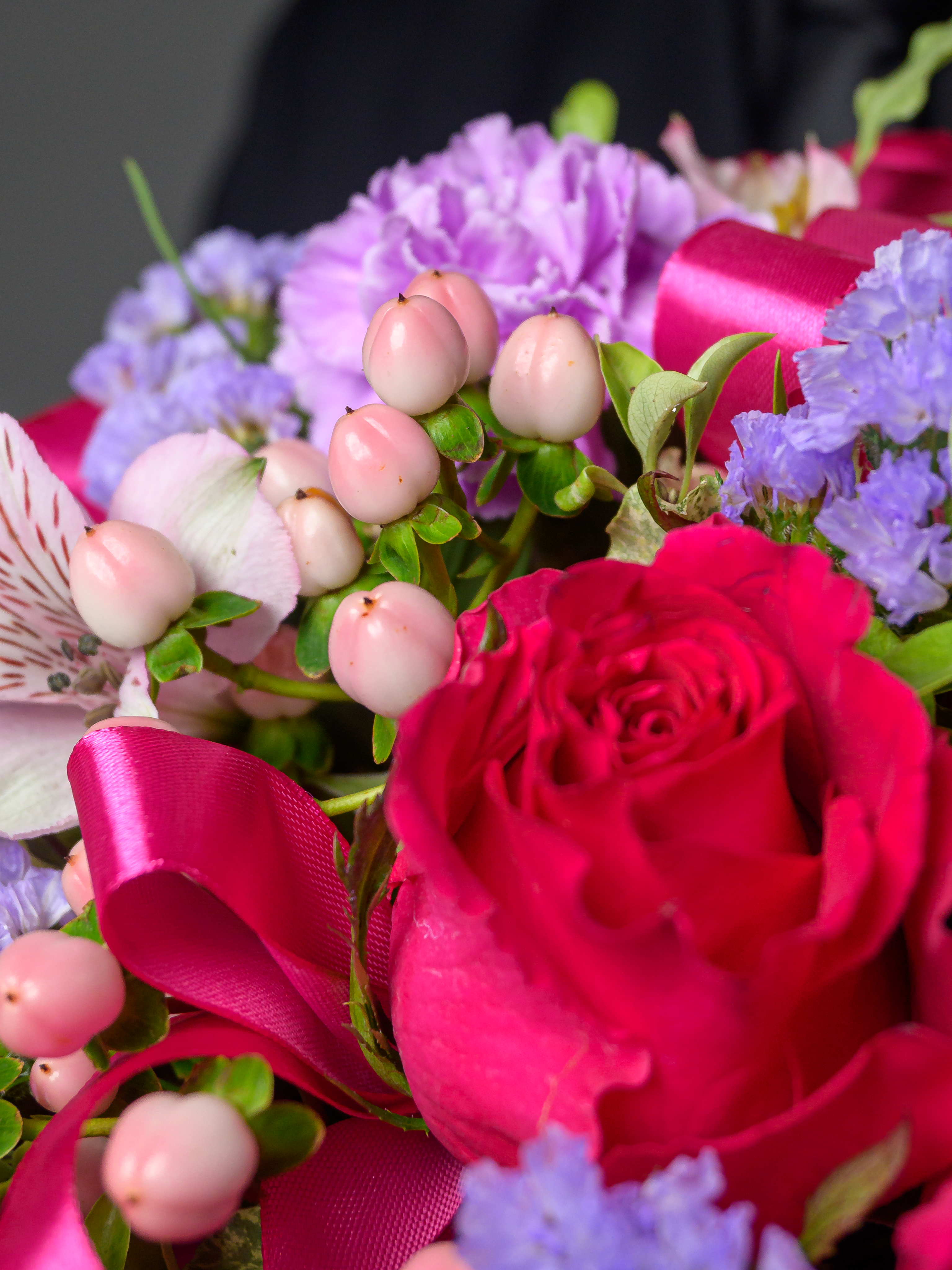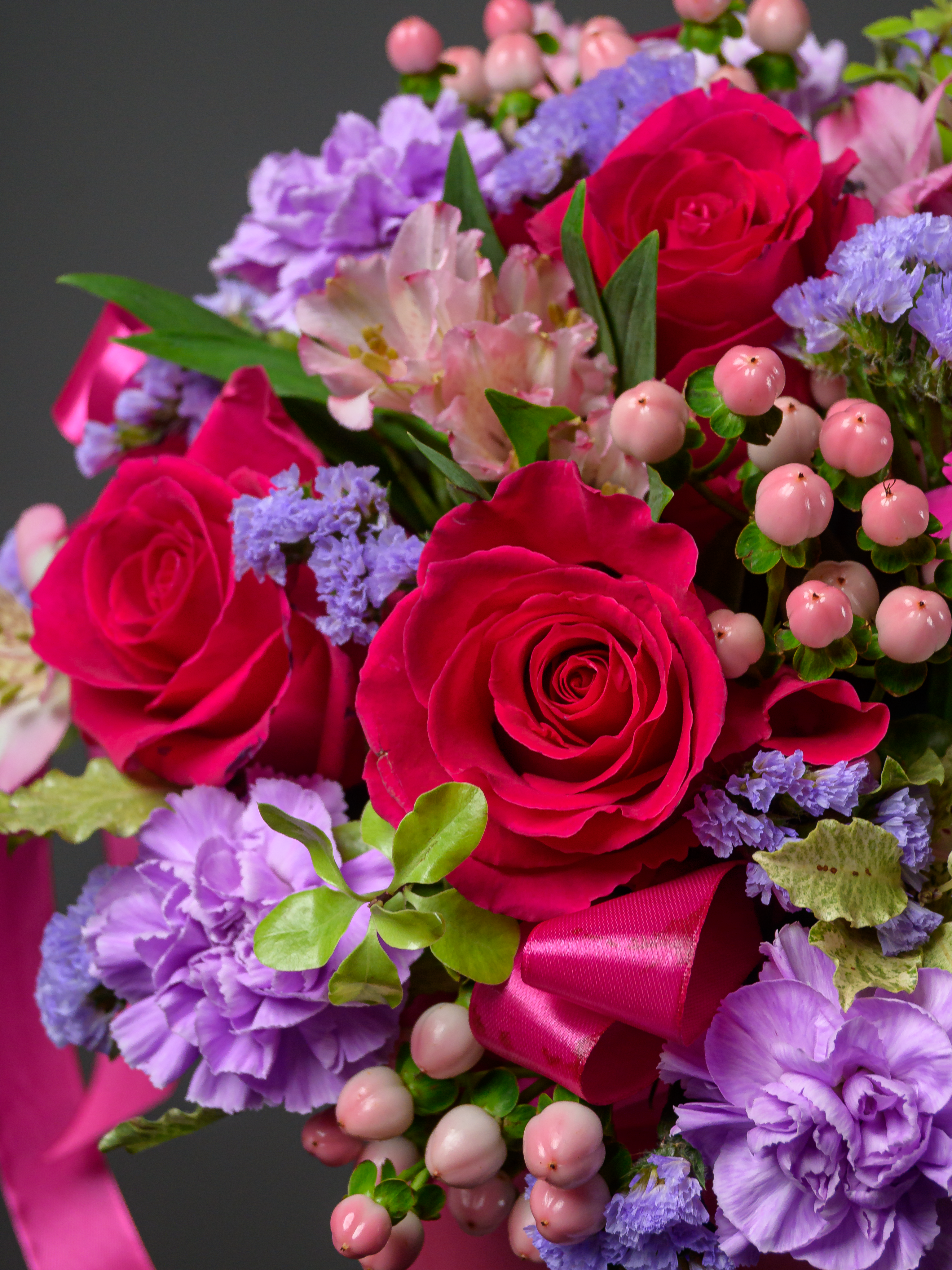 Пленка рулон, Лента атласная, Гиперикум, Альстромерия, Роза одноголовая микс, Гербера аква микс, Статица, Питоспорум, Оазис, Коробка, Гвоздика одноголовая лунная