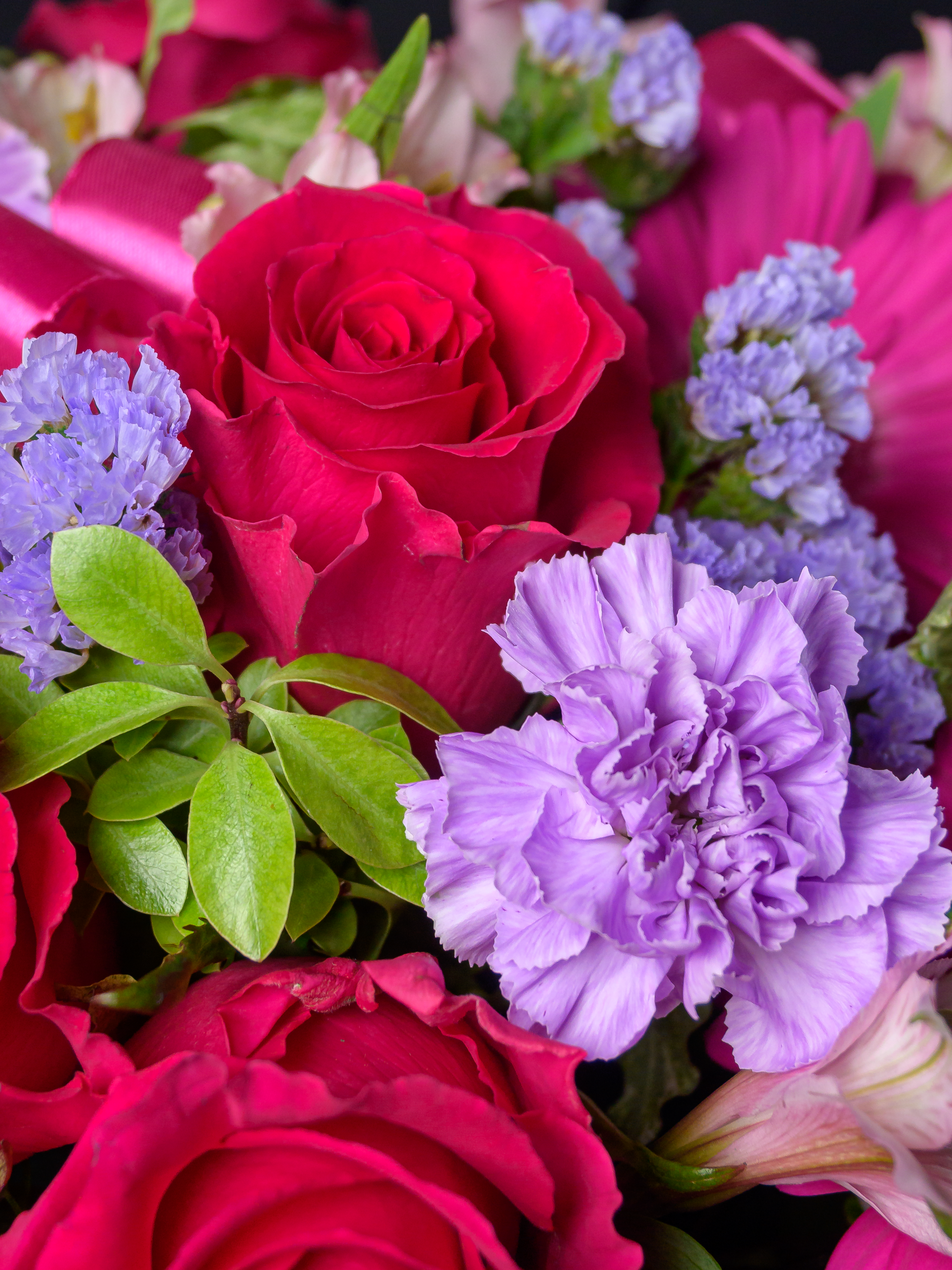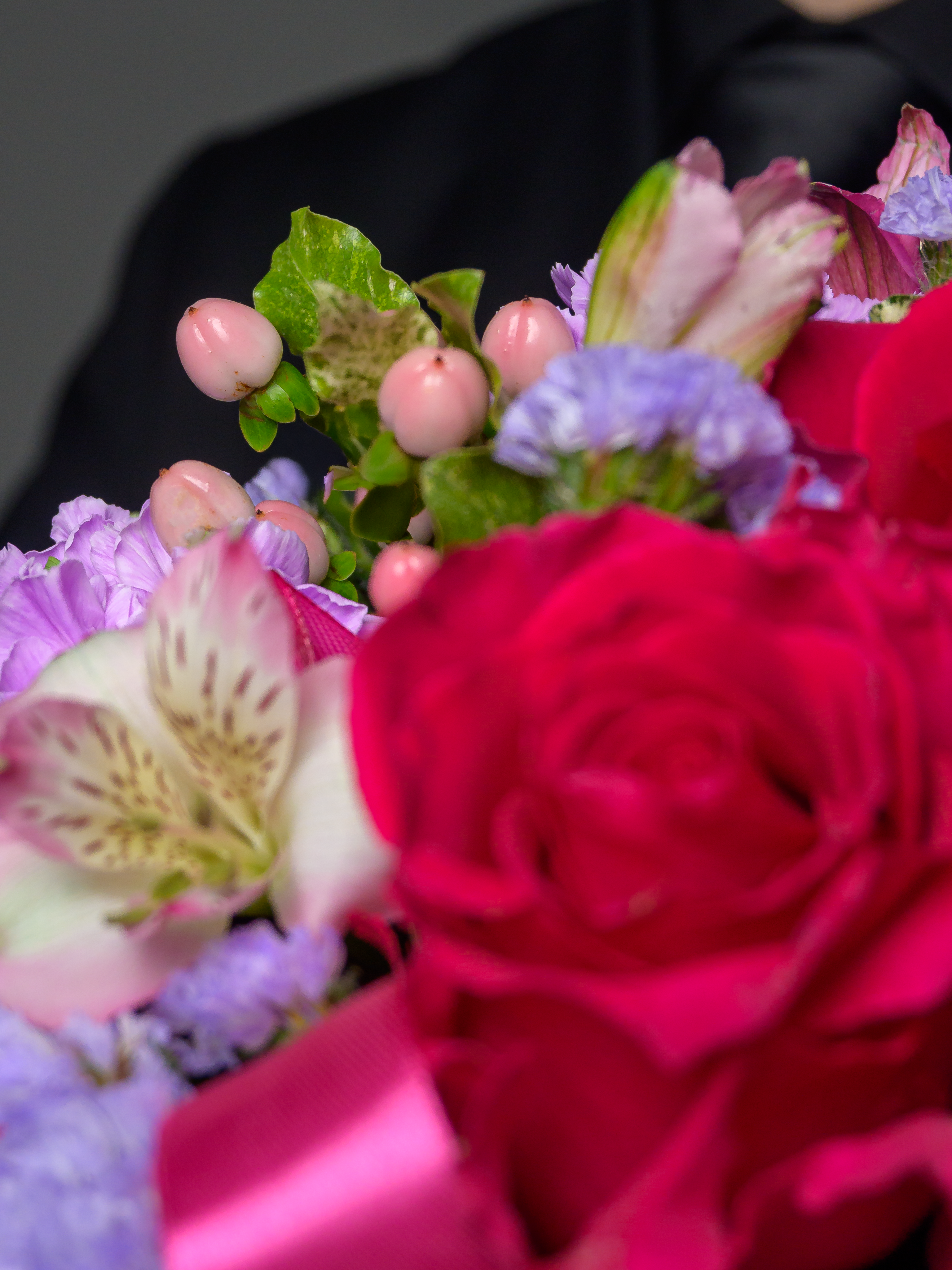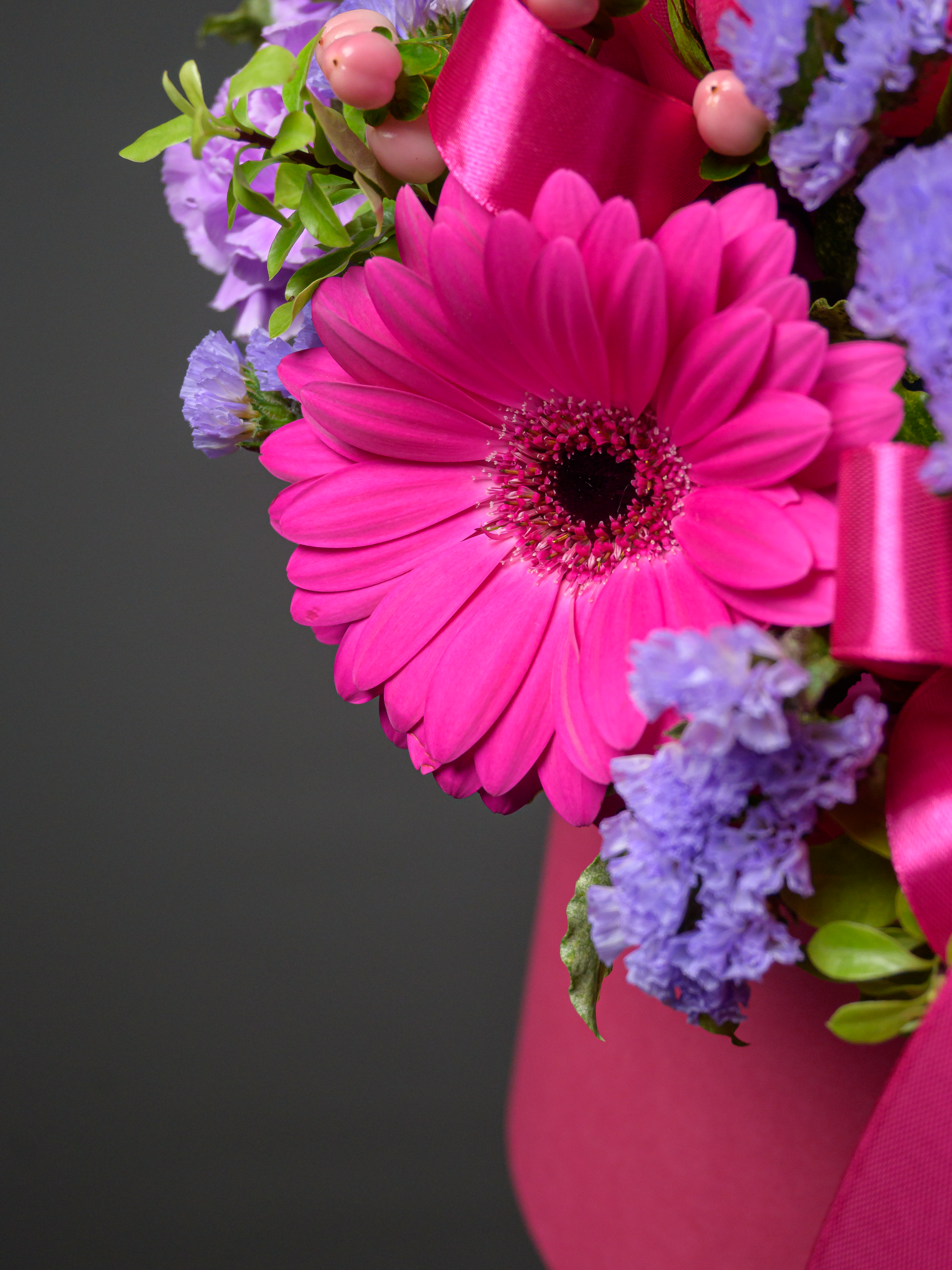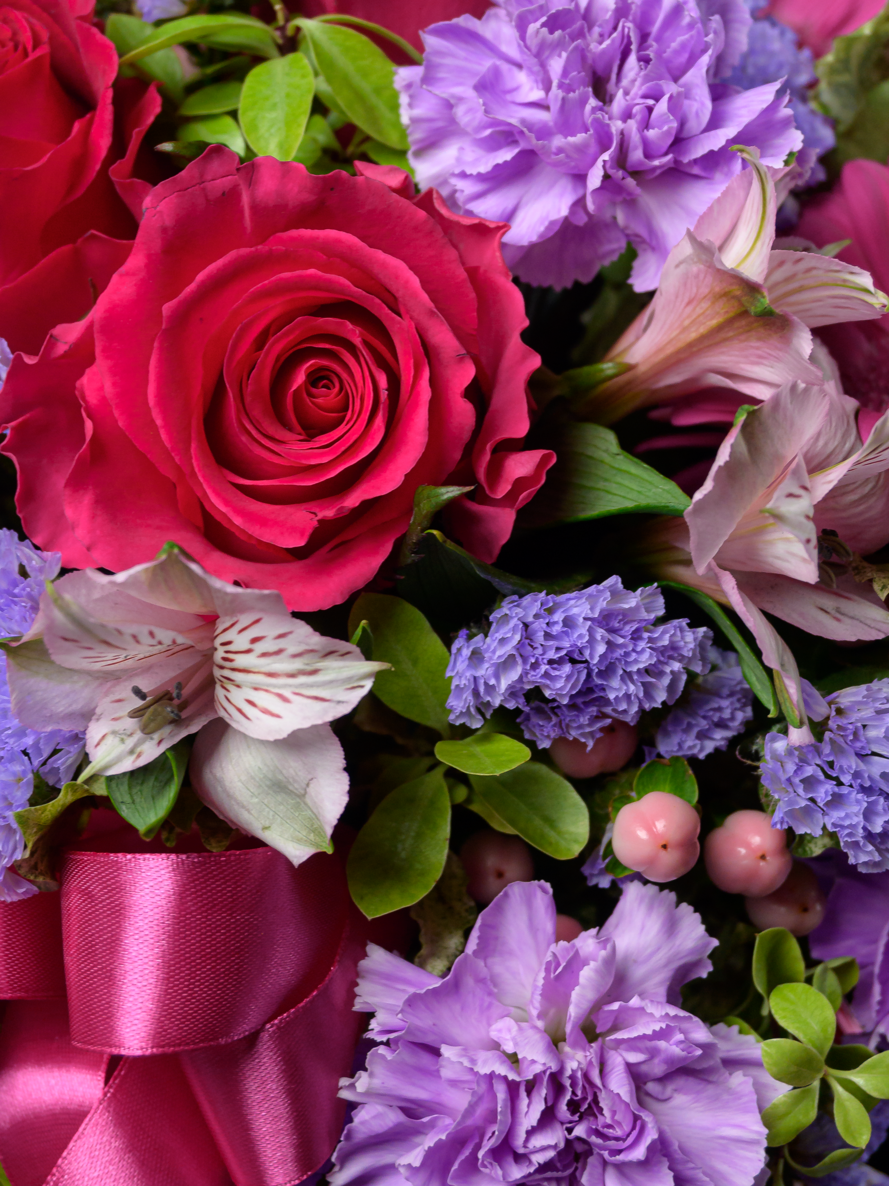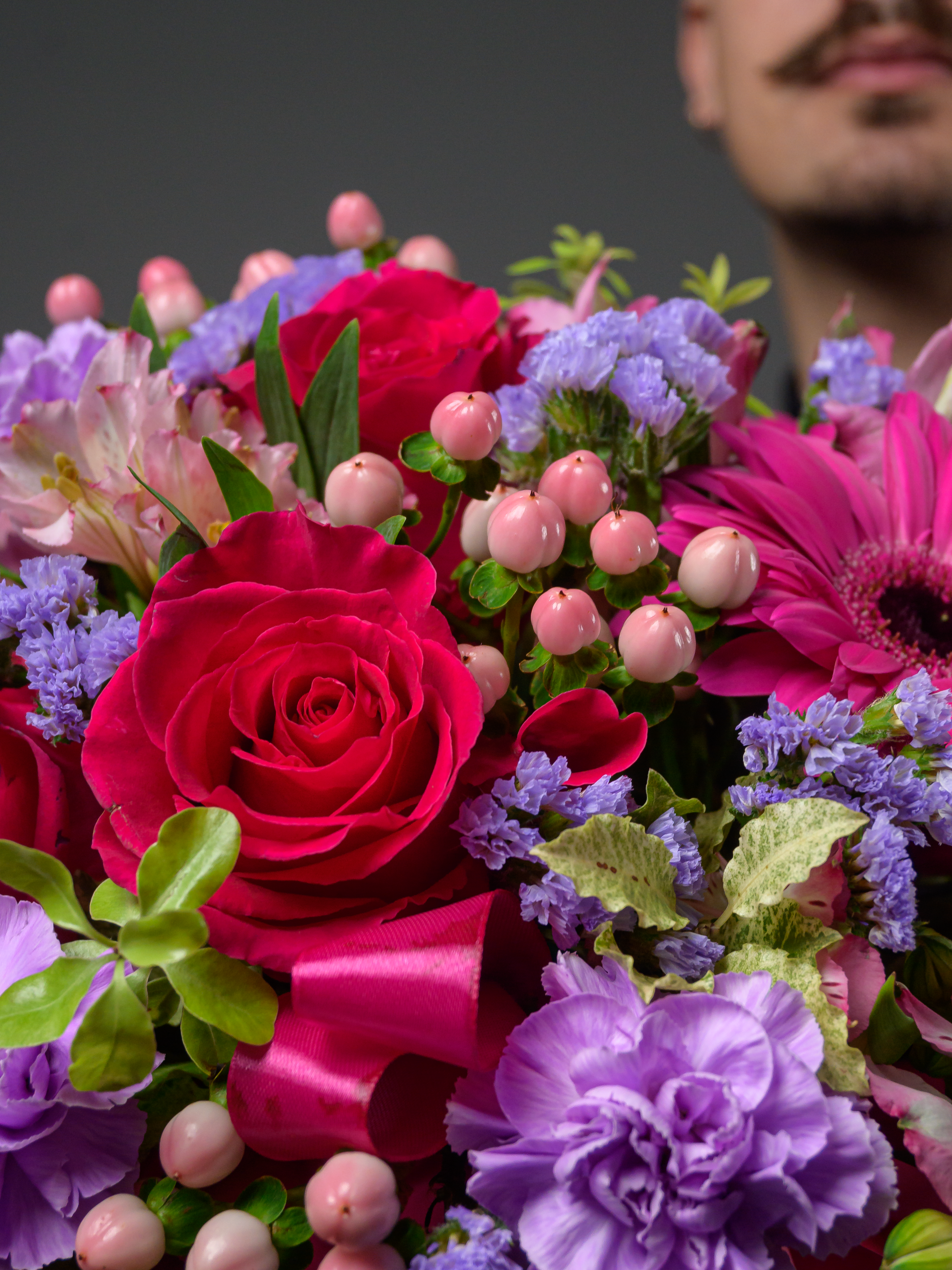 Пленка рулон, Лента атласная, Гиперикум, Альстромерия, Роза одноголовая микс, Гербера аква микс, Статица, Питоспорум, Оазис, Коробка, Гвоздика одноголовая лунная