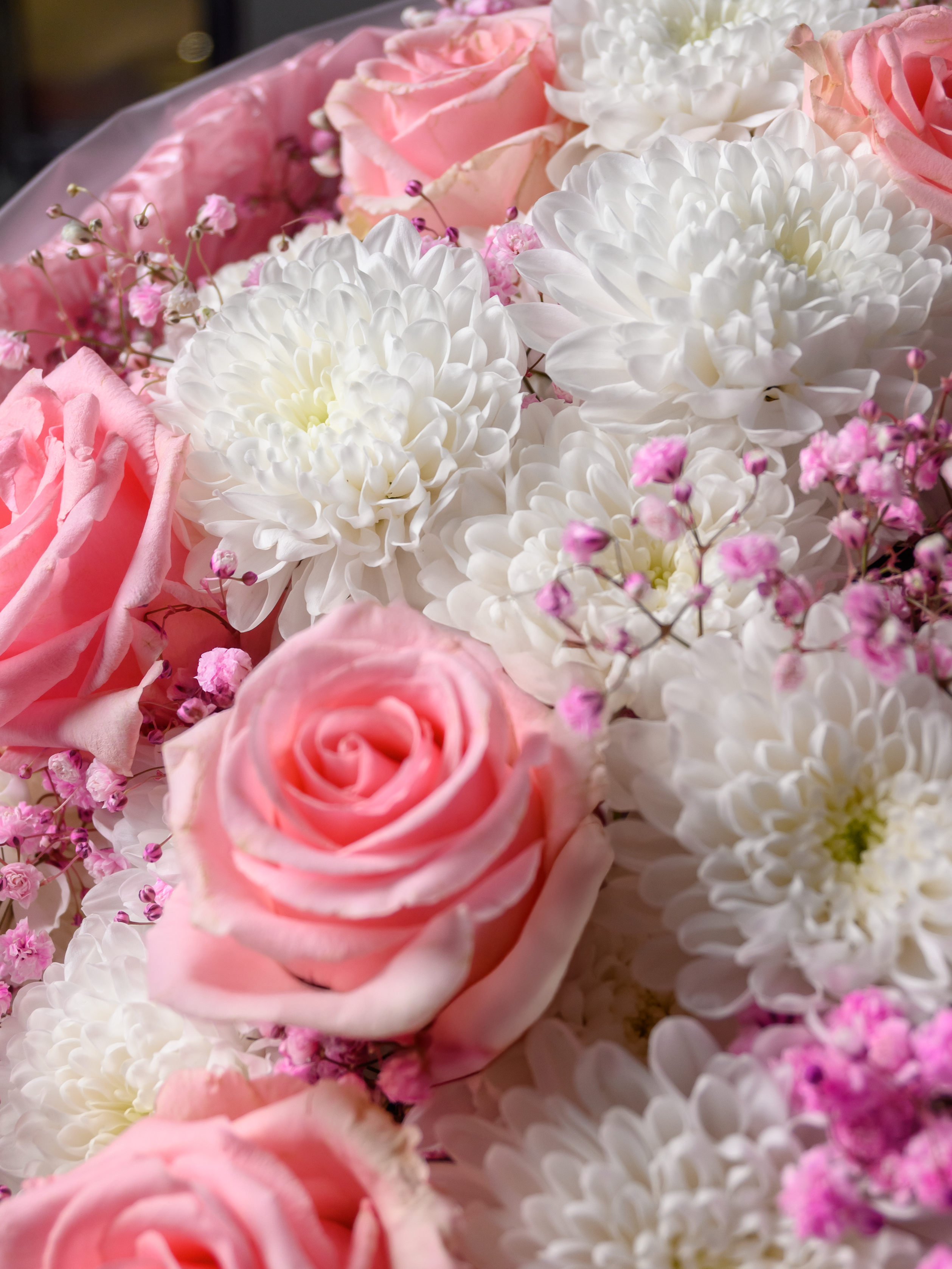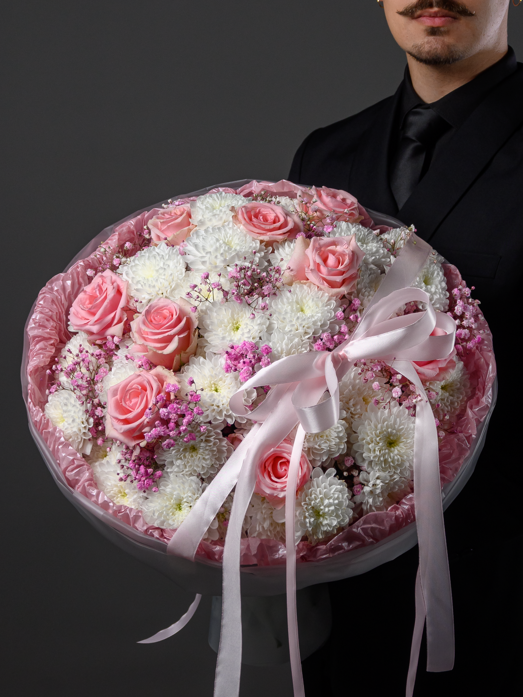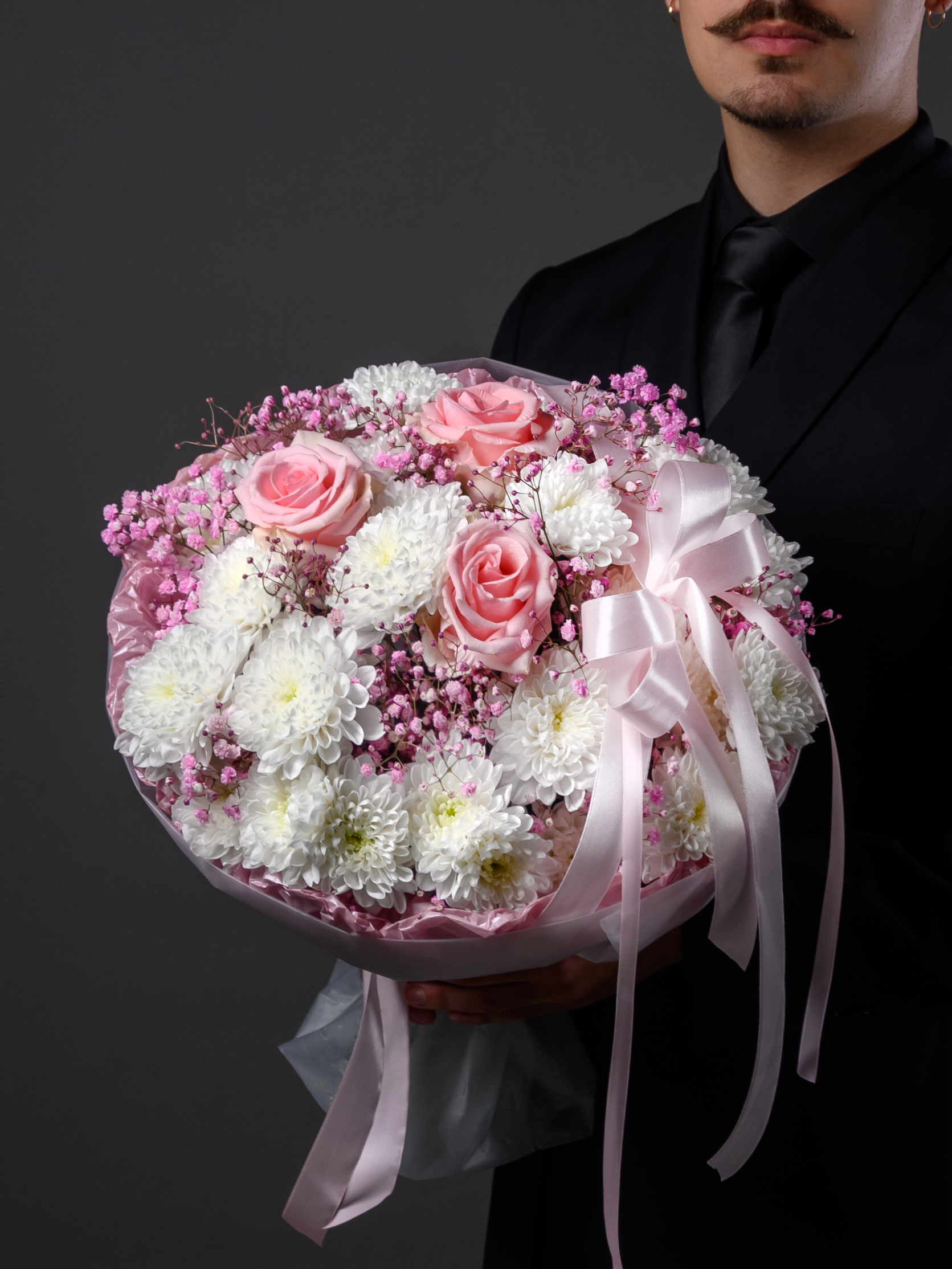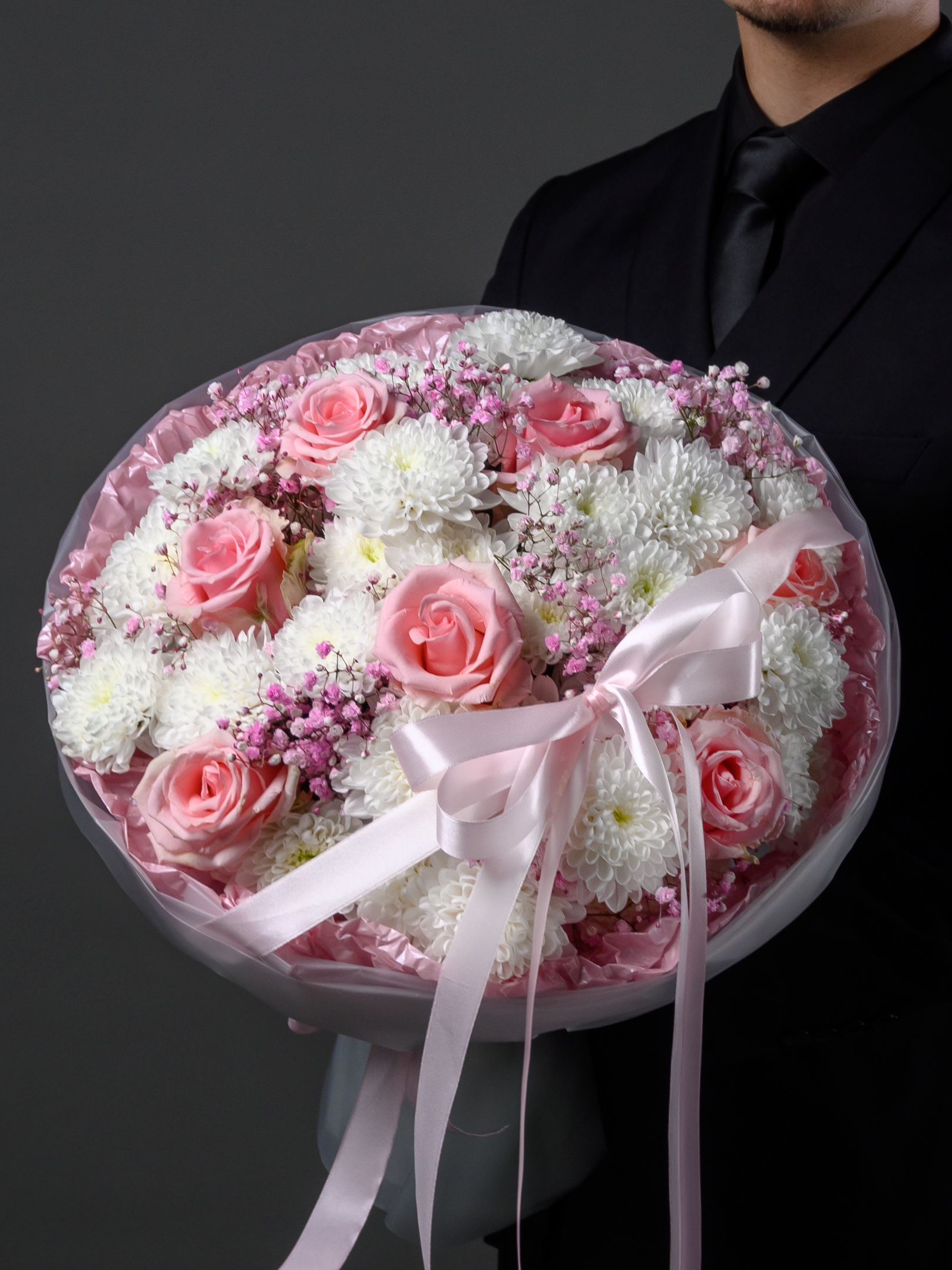 Букет "Нежные мечты" станет идеальным выражением ваших чувств! Розы нежно-розового цвета подчеркивают изысканность композиции, а сочетание белой хризантемы и гипсофилы создает нежную цветовую гамму.
