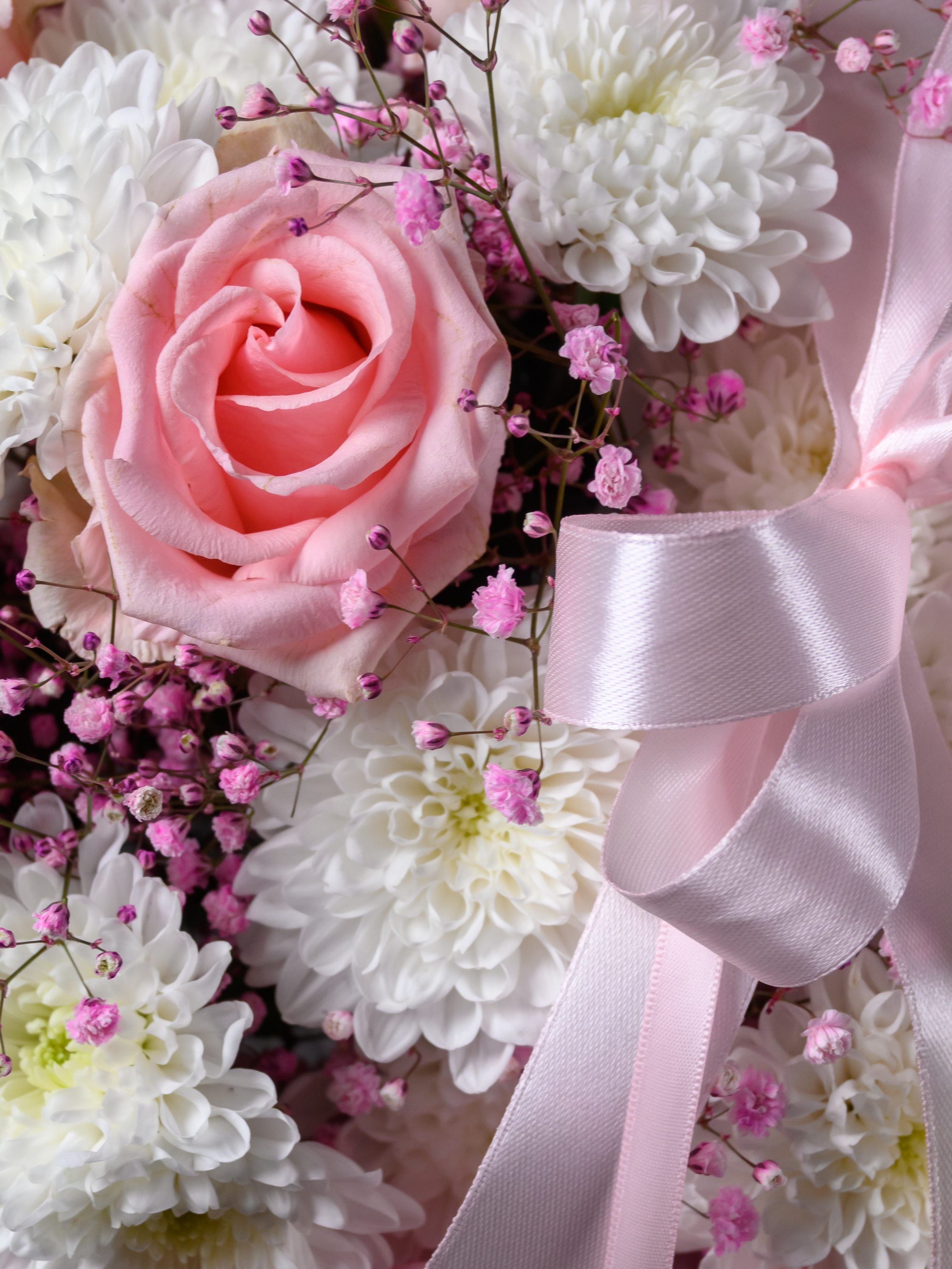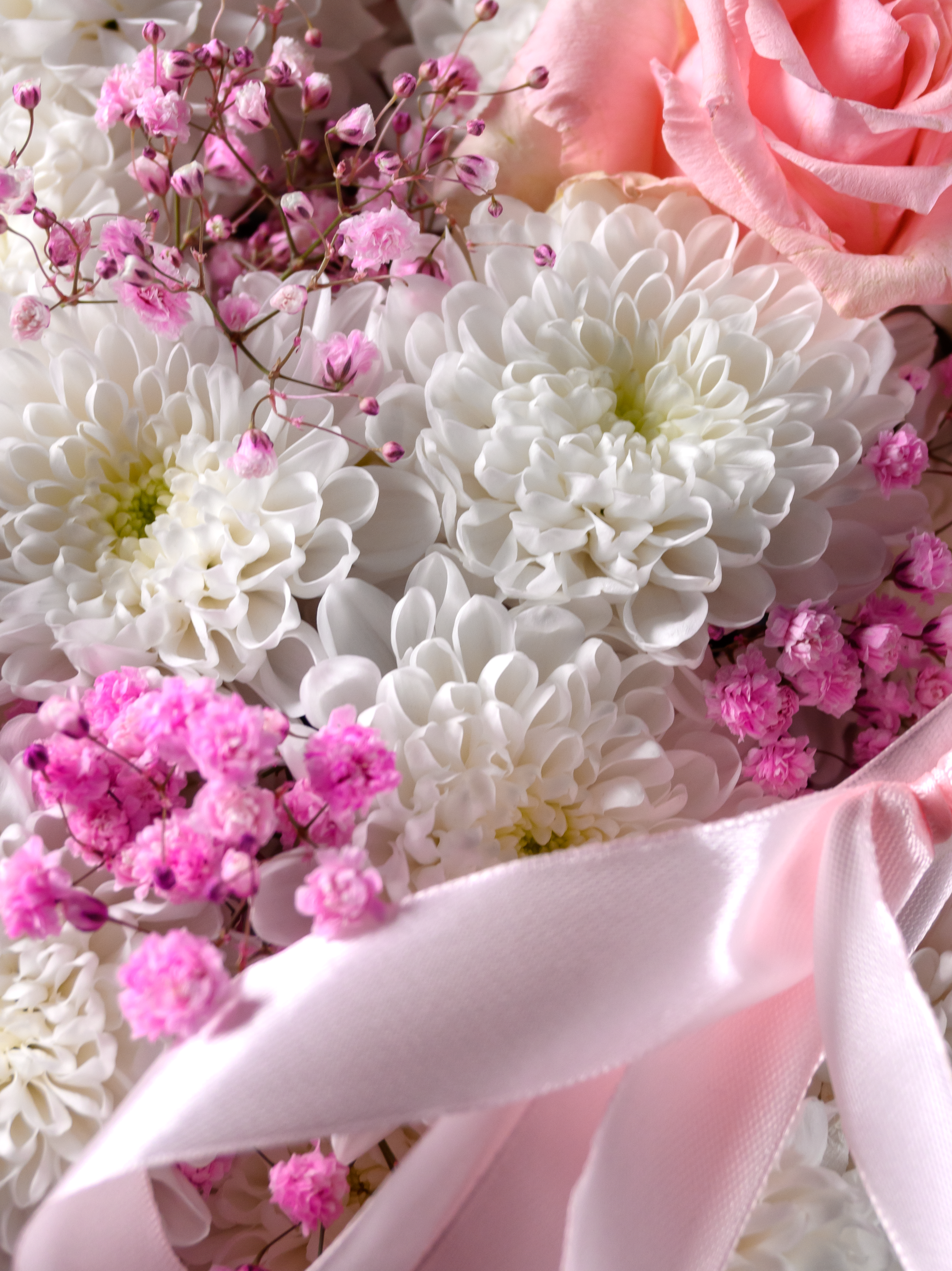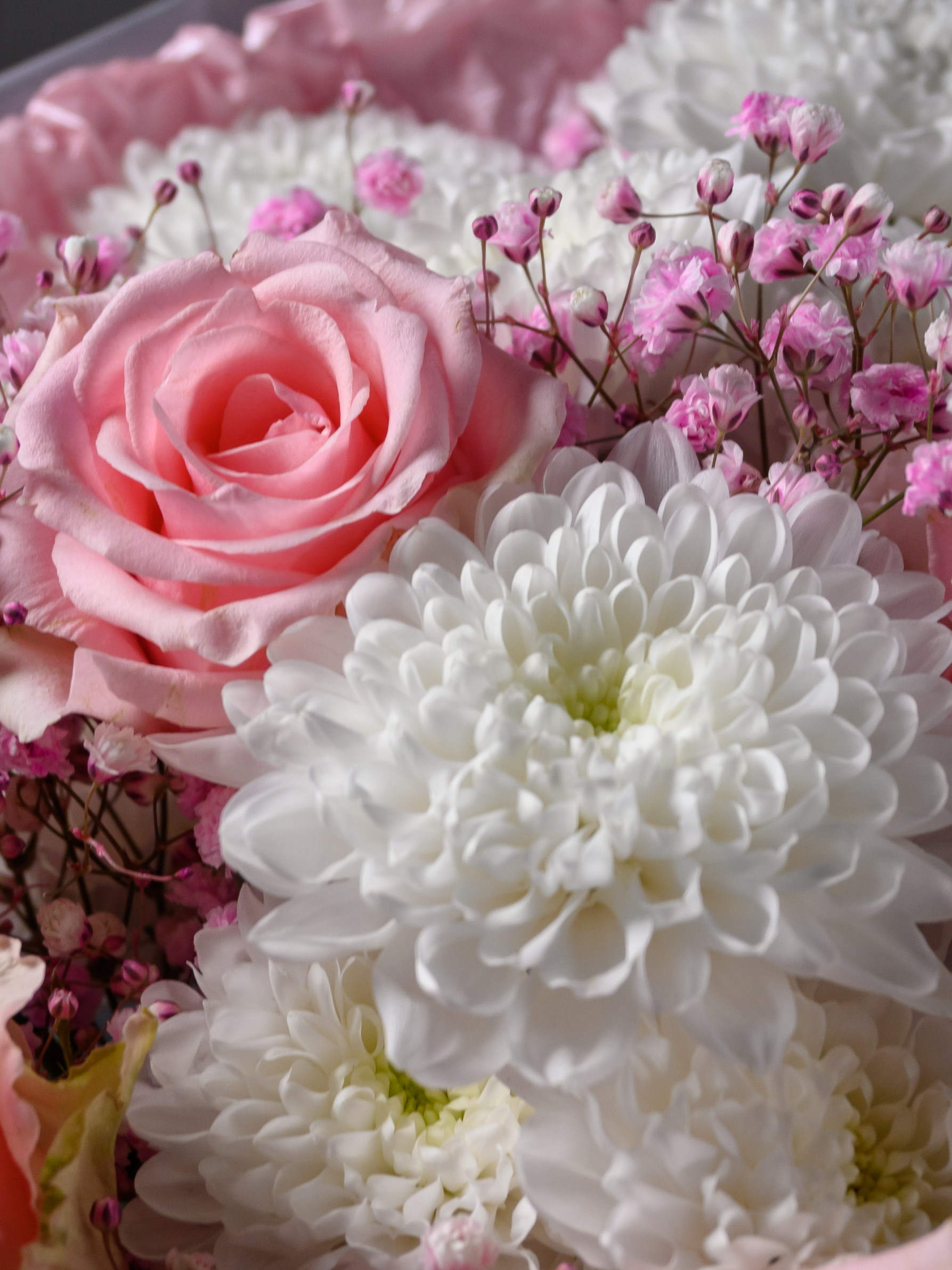 Букет "Нежные мечты" станет идеальным выражением ваших чувств! Розы нежно-розового цвета подчеркивают изысканность композиции, а сочетание белой хризантемы и гипсофилы создает нежную цветовую гамму.