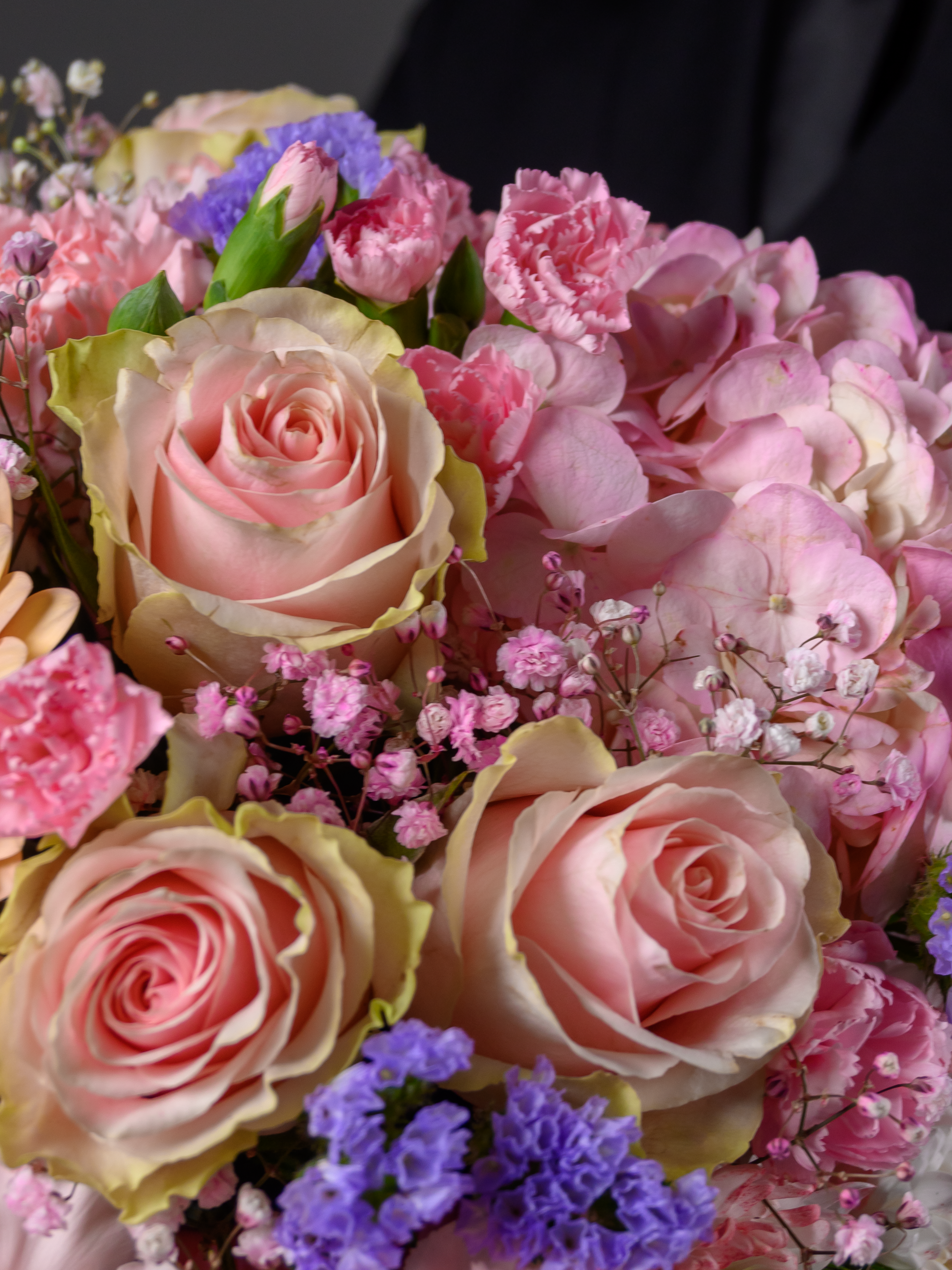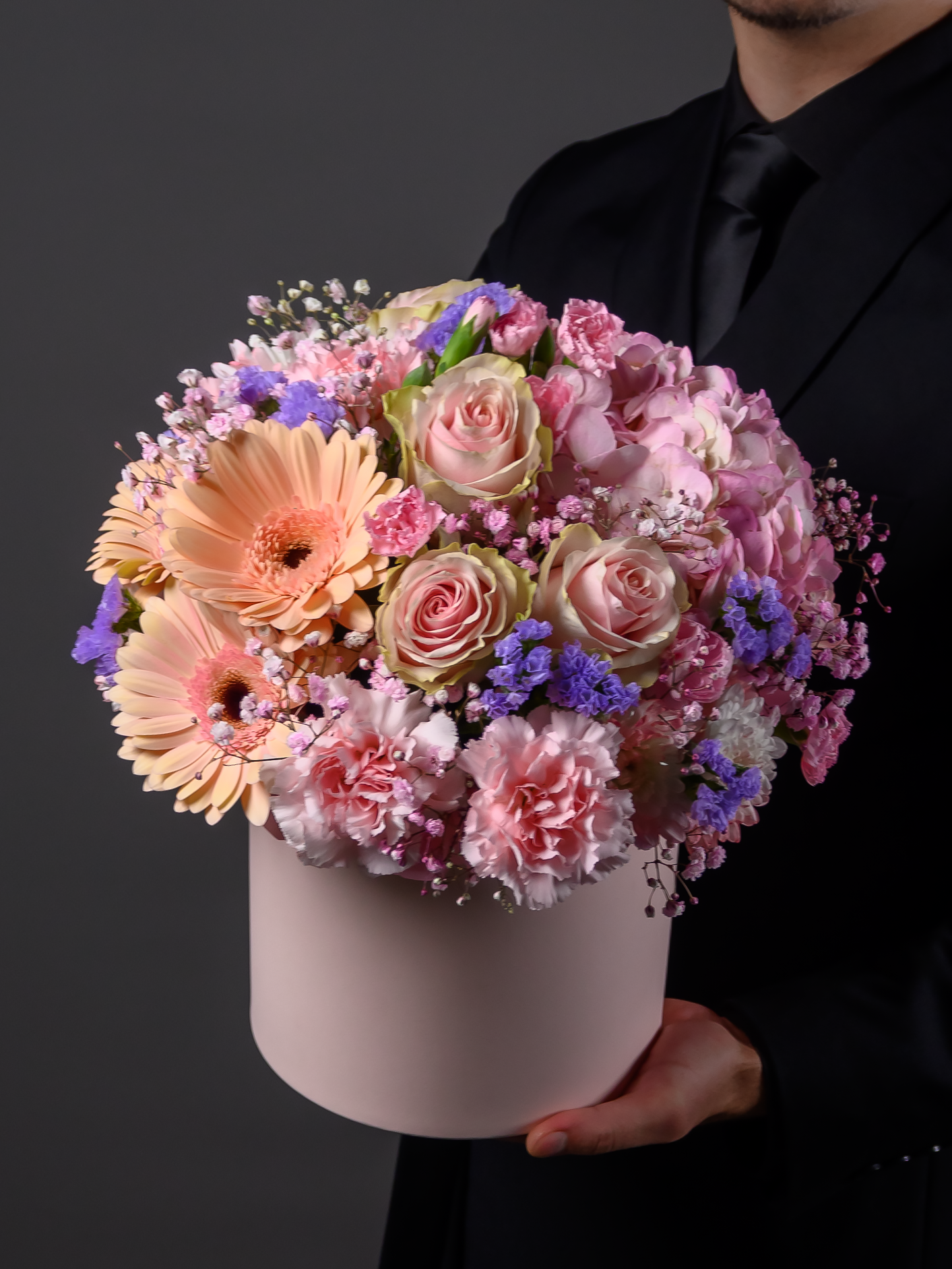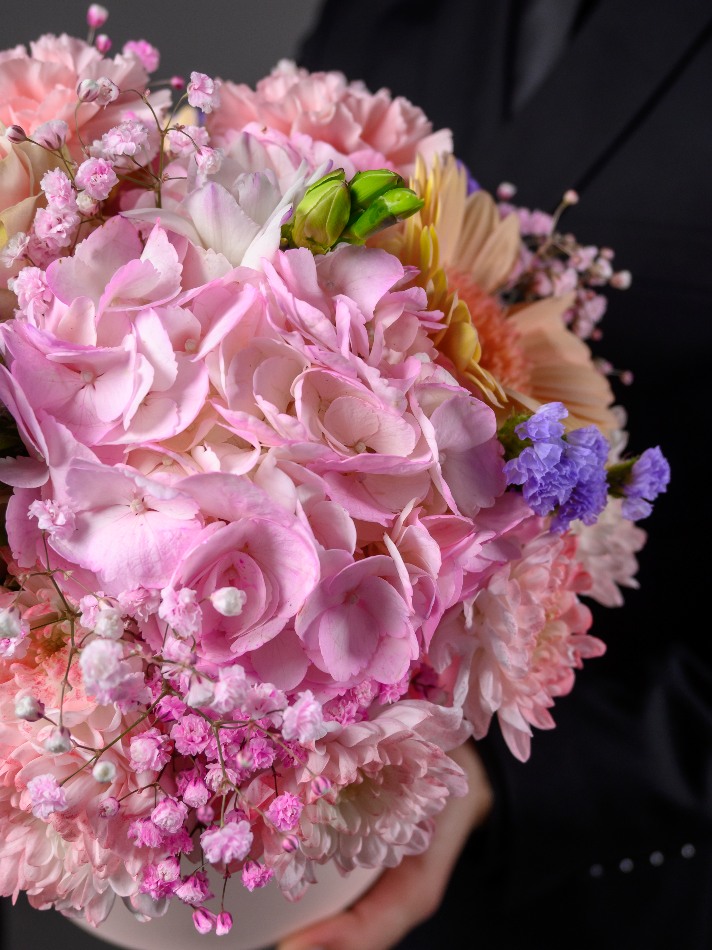 "Предчувствие" — это роскошный букет из гортензии, гвоздики, статицы, хризантемы, герберы, гипсофилы и фрезии, дополненный красочным оформлением. Ваша благодарность, любовь либо поздравление засверкает новыми красками! Объемные размеры (M-20–25см, L-25–30см, XL-30–35см) подчеркнут важность вашего внимания. Создайте незабываемые эмоции близким с нашим букетом!