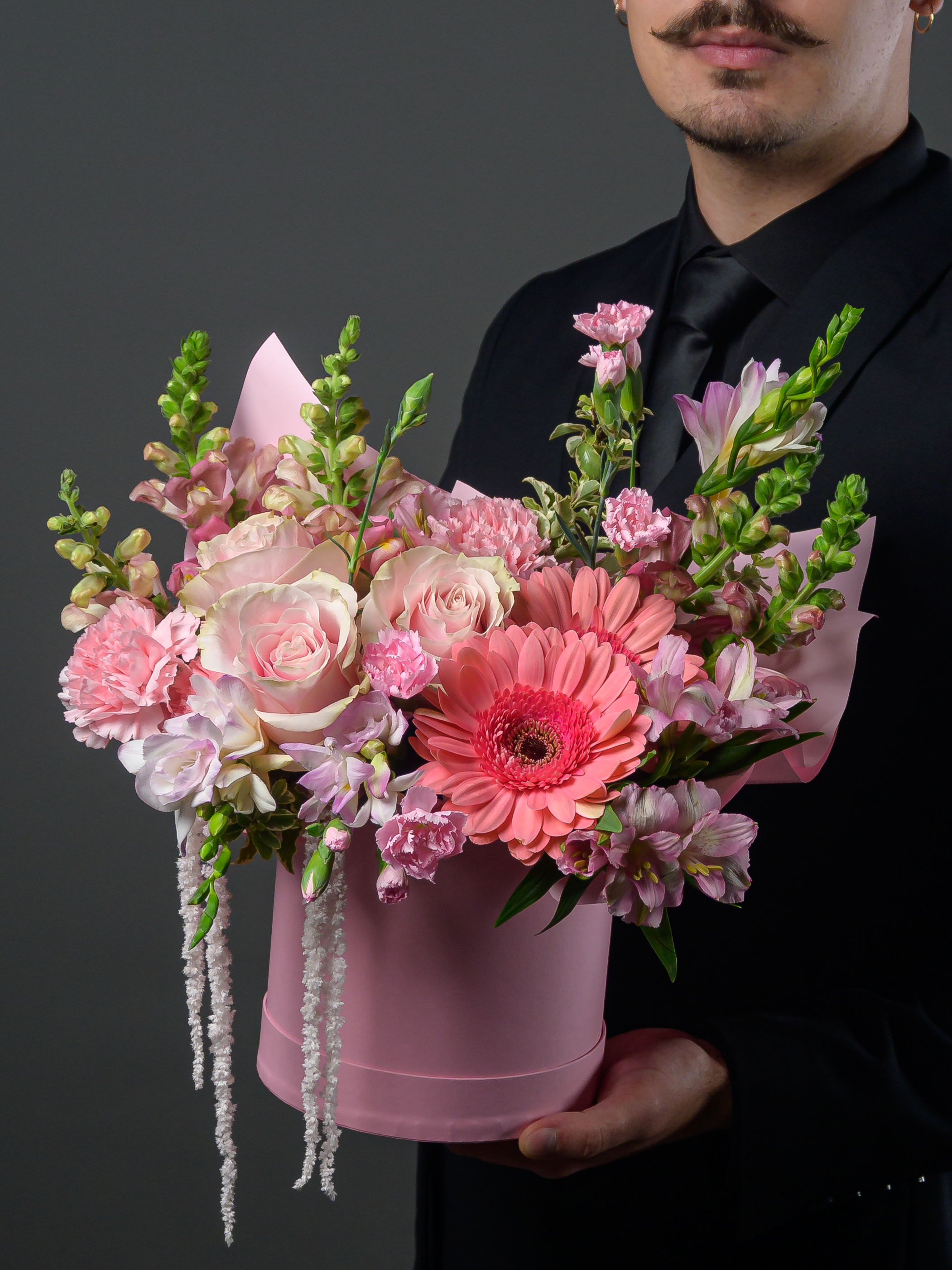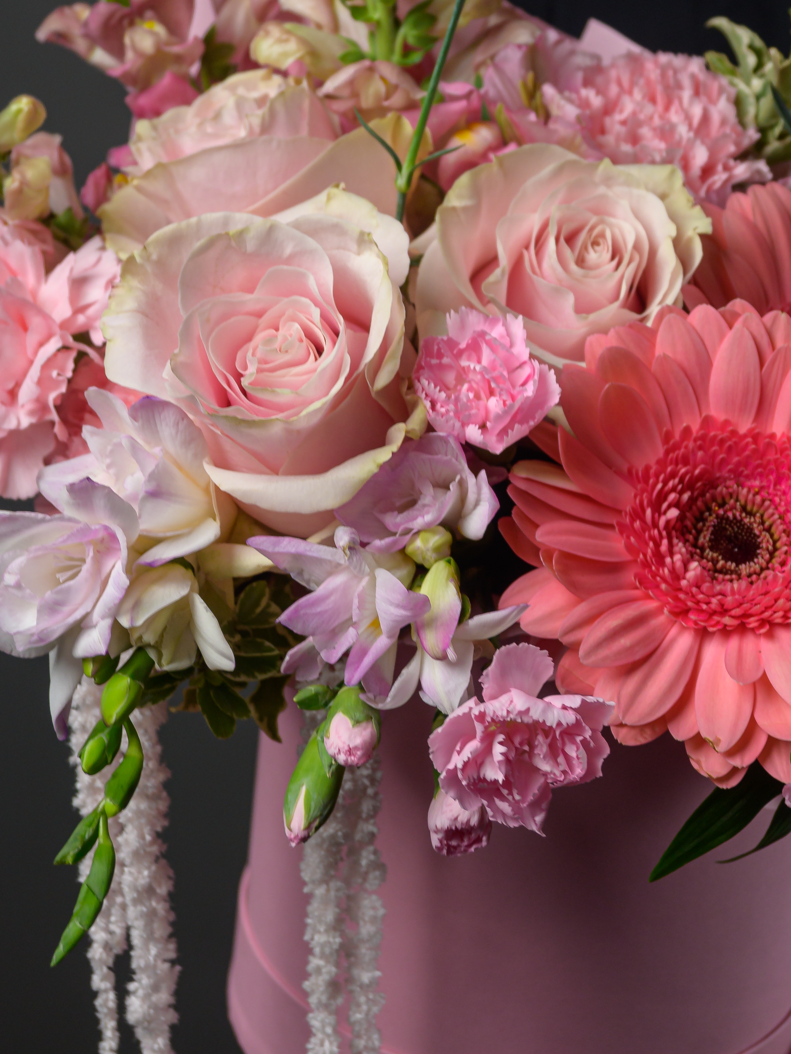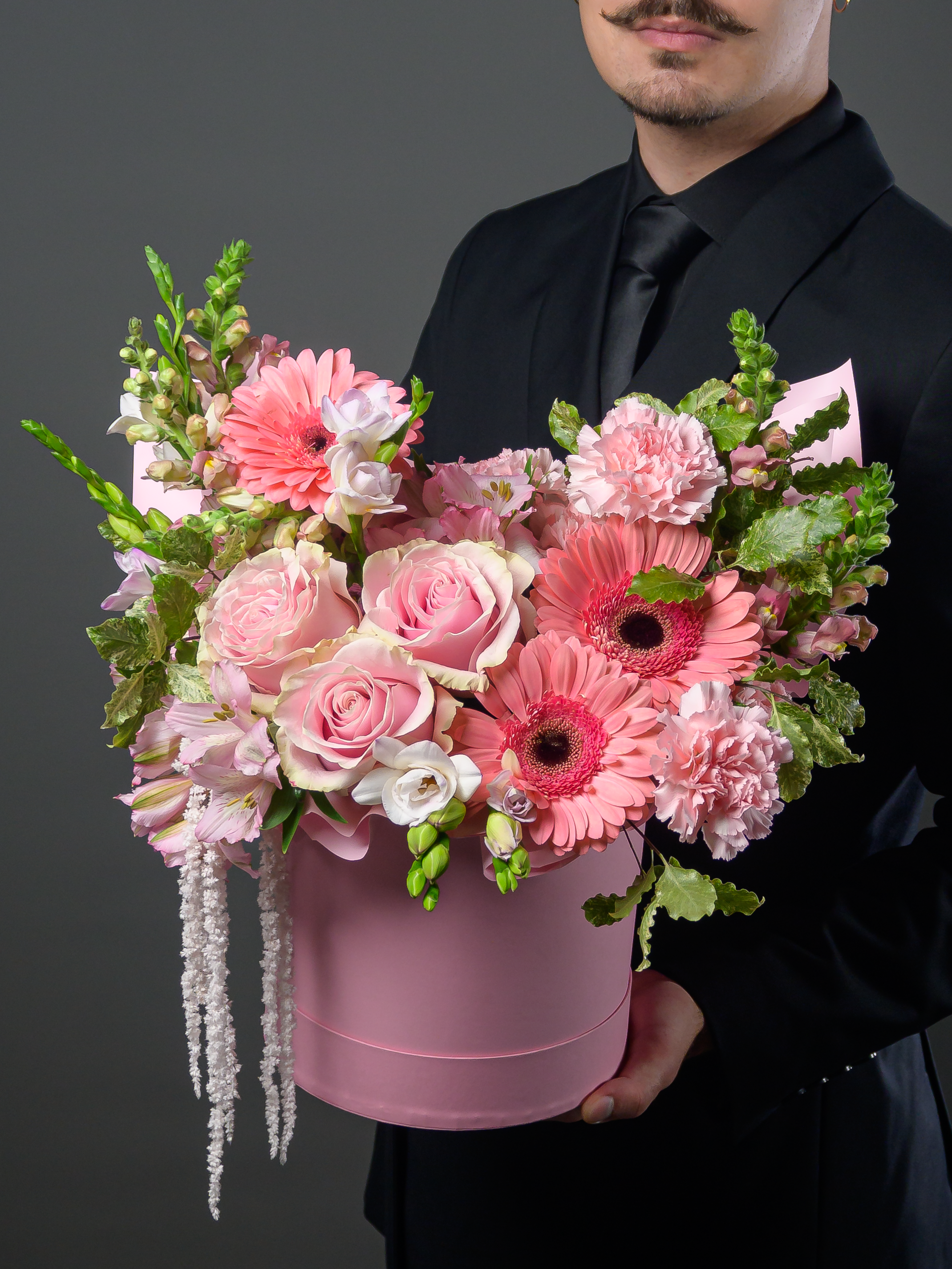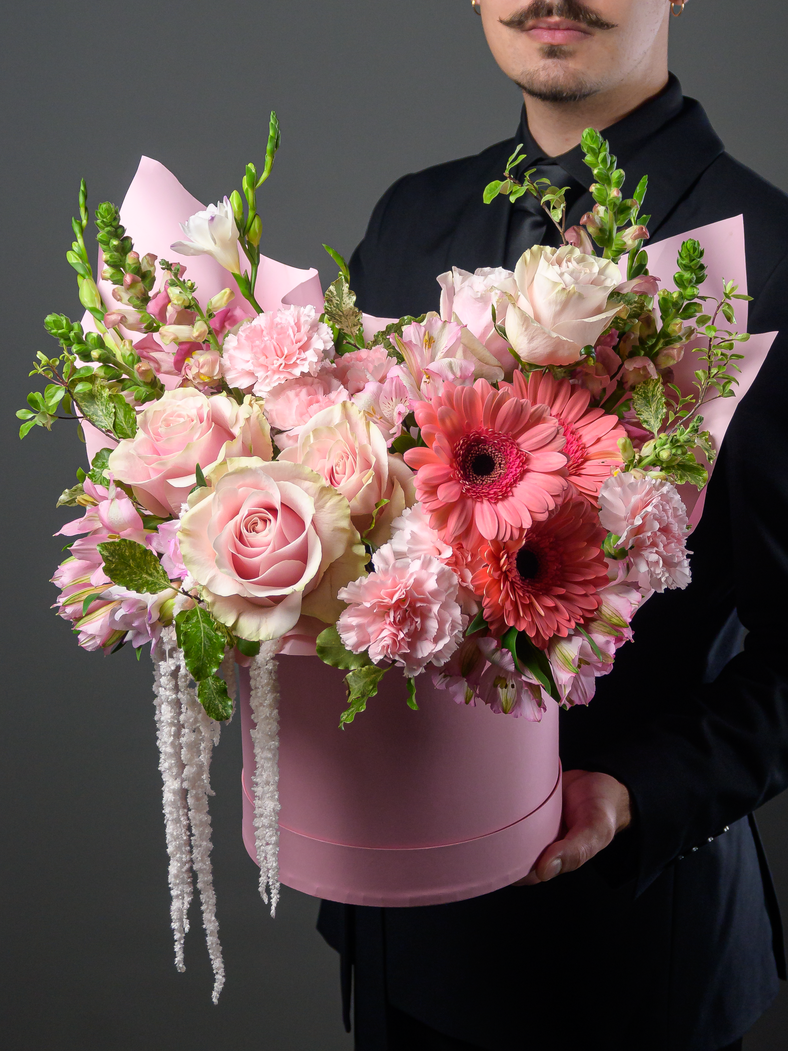 Пленка рулон, Альстромерия, Роза одноголовая микс, Гвоздика одноголовая микс, Гербера аква микс, Фрезия, Гвоздика кустовая, Антирринум, Питоспорум, Оазис, Коробка, Амарантус сухоцвет