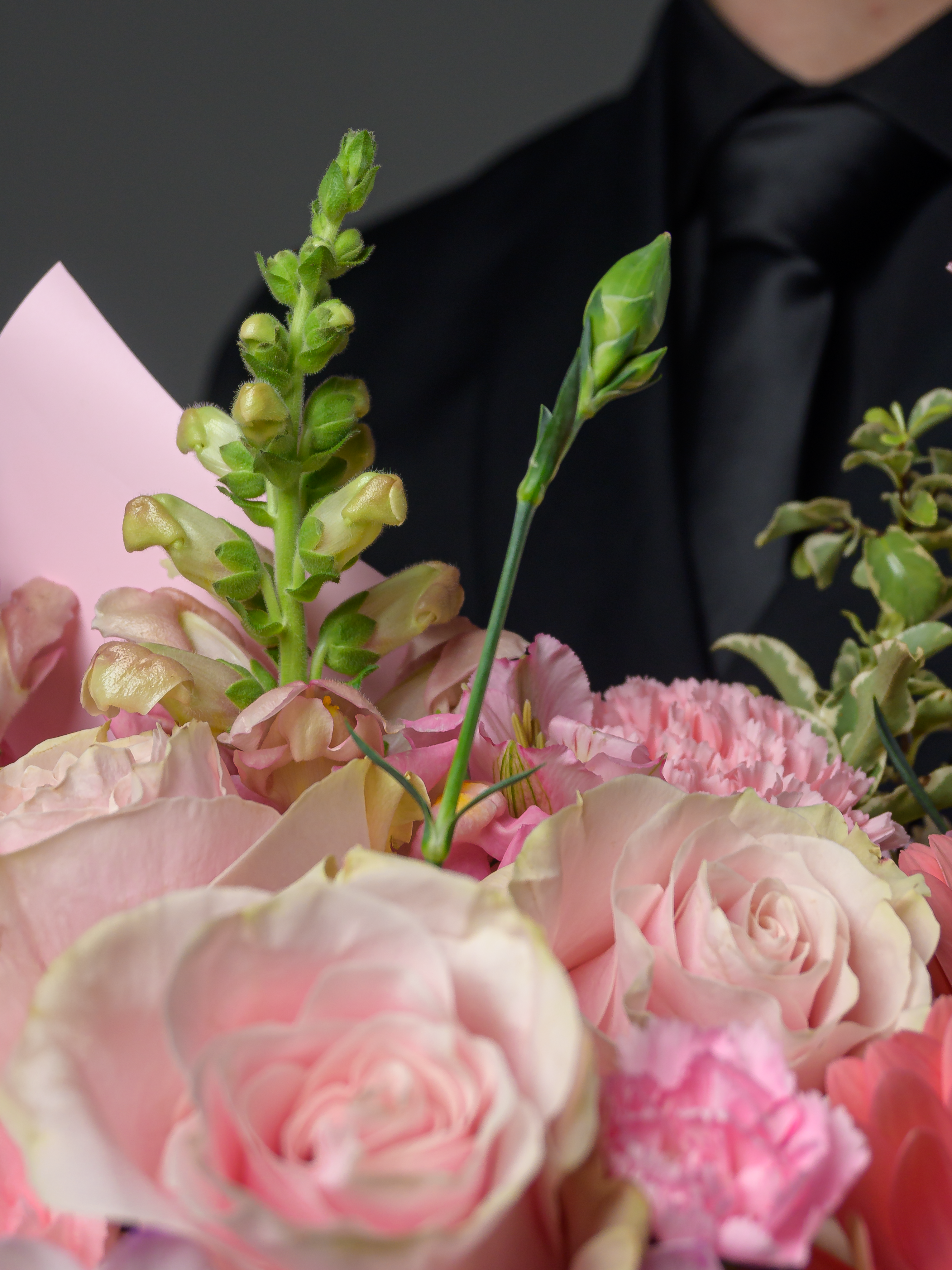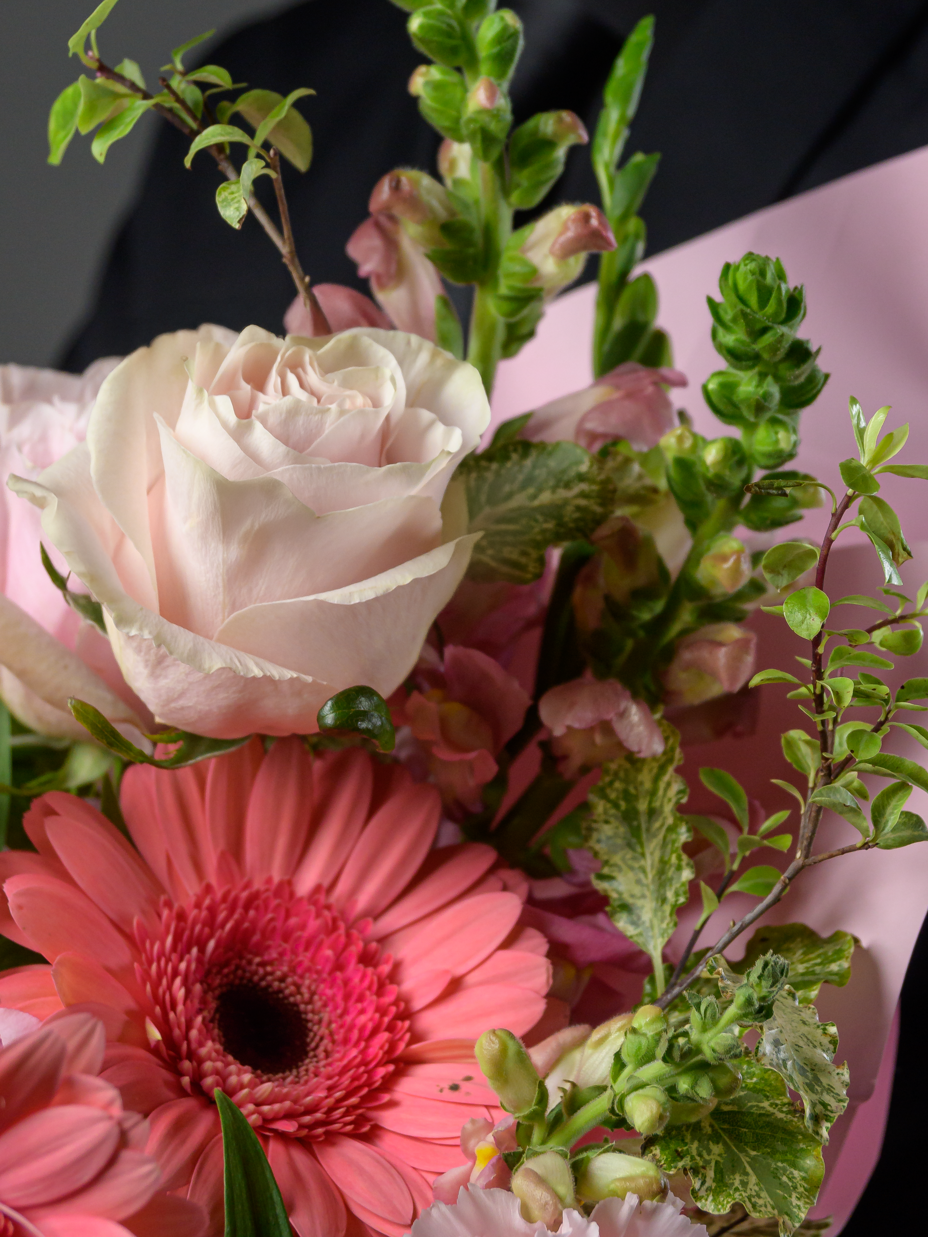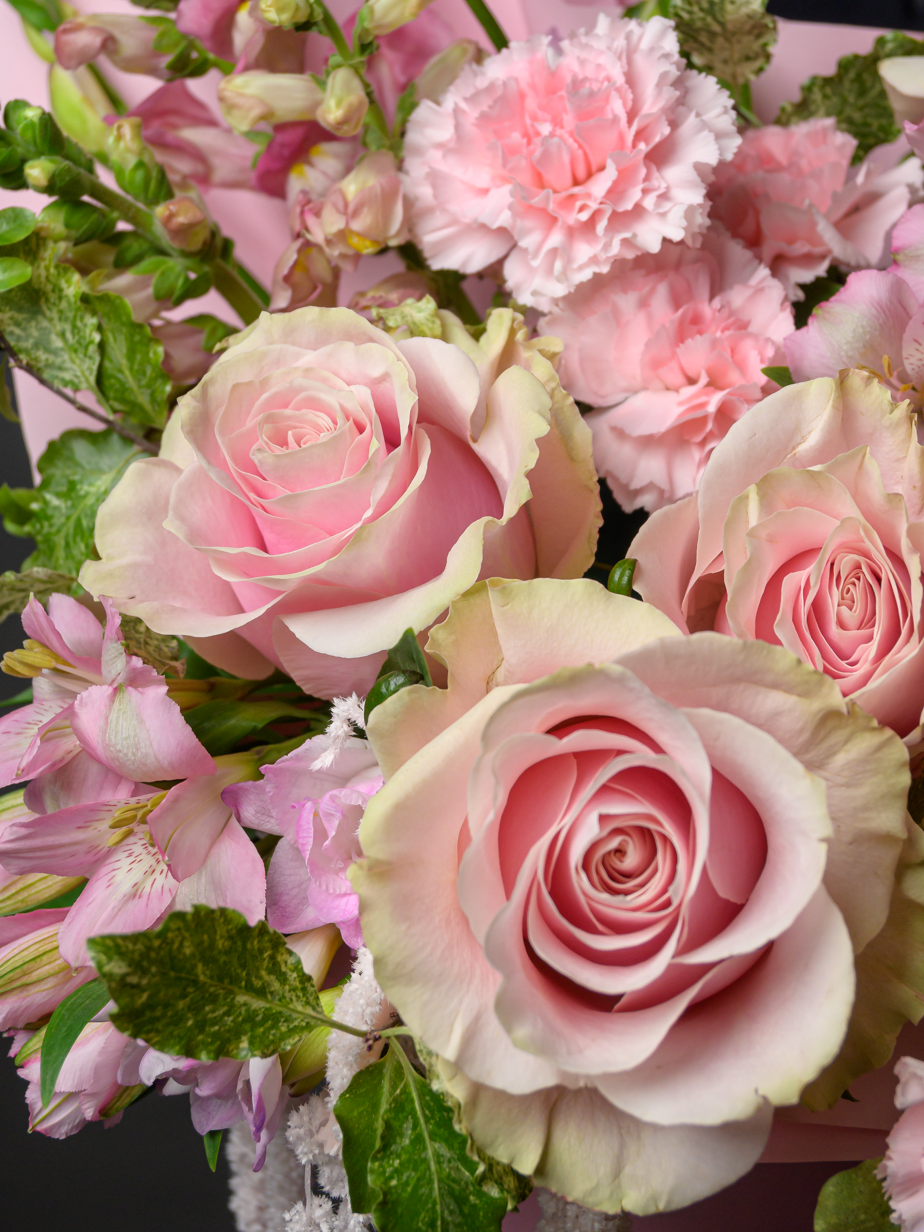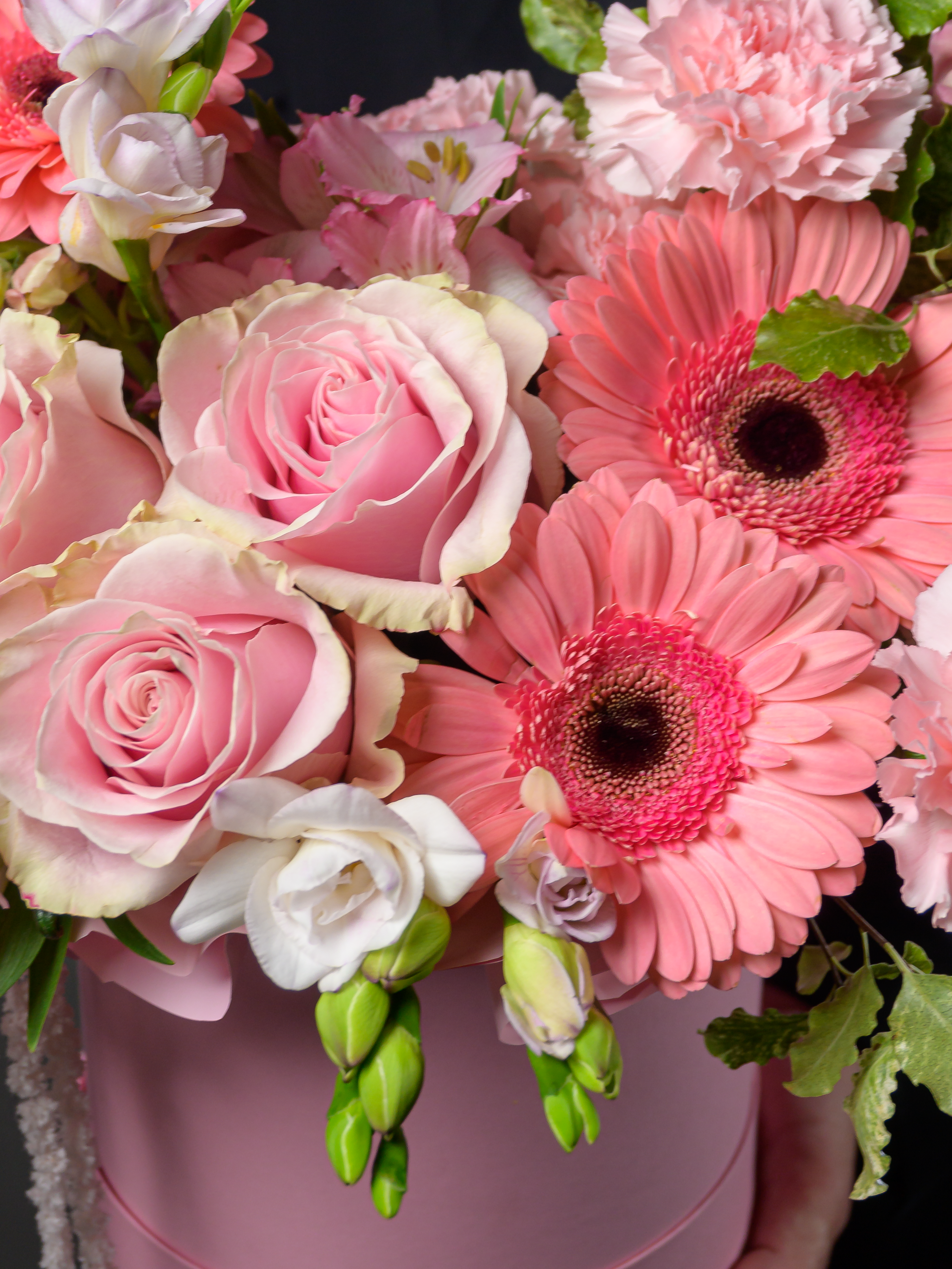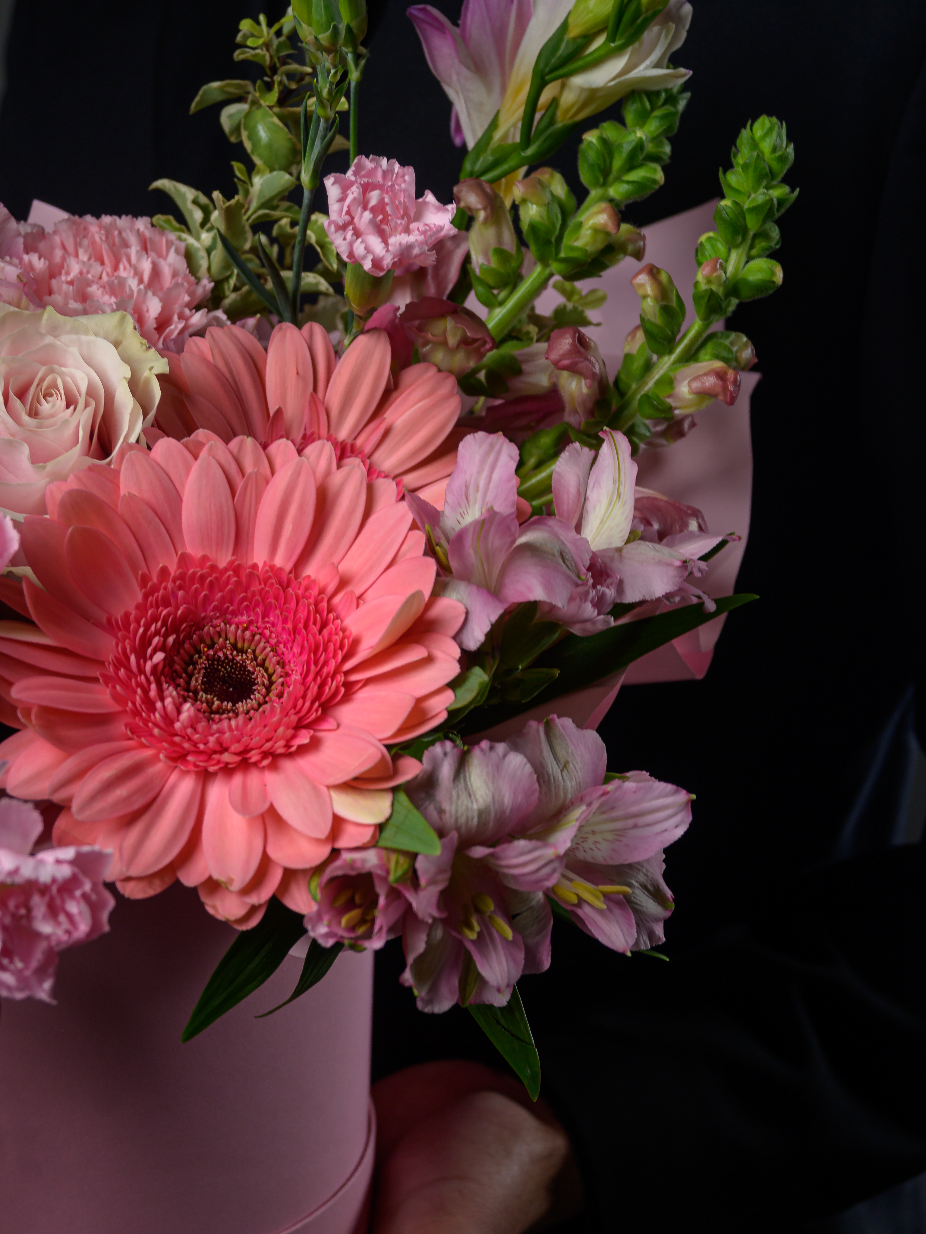 Пленка рулон, Альстромерия, Роза одноголовая микс, Гвоздика одноголовая микс, Гербера аква микс, Фрезия, Гвоздика кустовая, Антирринум, Питоспорум, Оазис, Коробка, Амарантус сухоцвет