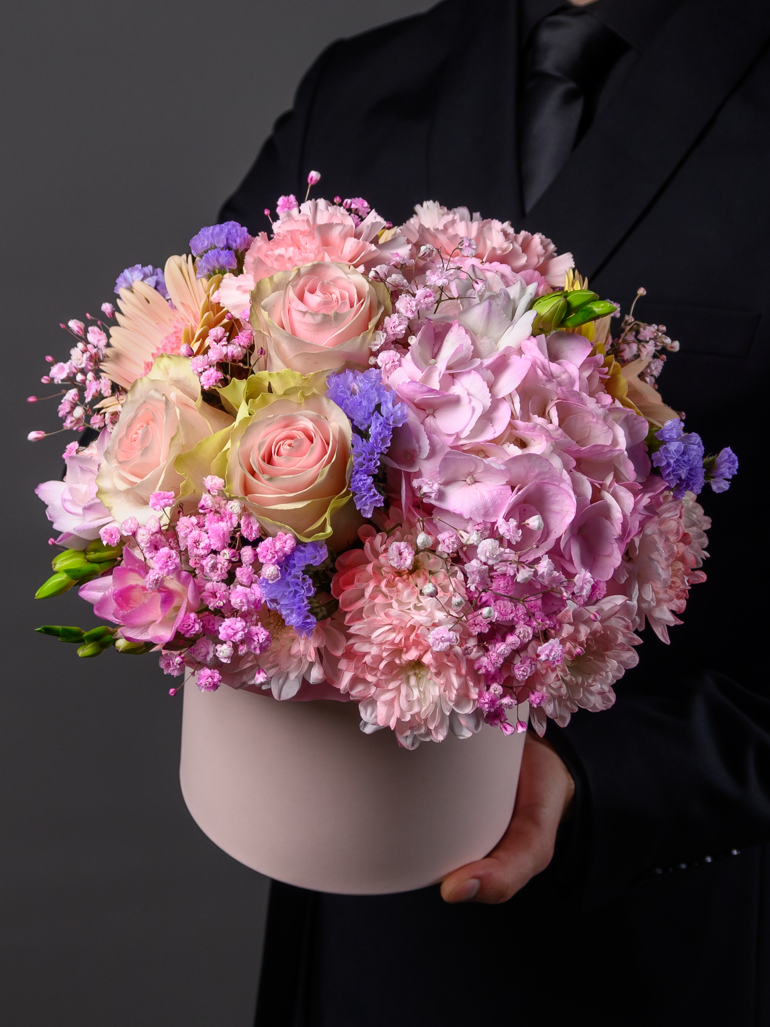 "Тепло в сердце" — это роскошный букет из гортензии, гвоздики, статицы, хризантемы, герберы, гипсофилы и фрезии, дополненный красочным оформлением. Ваша благодарность, любовь либо поздравление засверкает новыми красками! Объемные размеры (M-20–25см, L-25–30см, XL-30–35см) подчеркнут важность вашего внимания. Создайте незабываемые эмоции близким с нашим букетом!