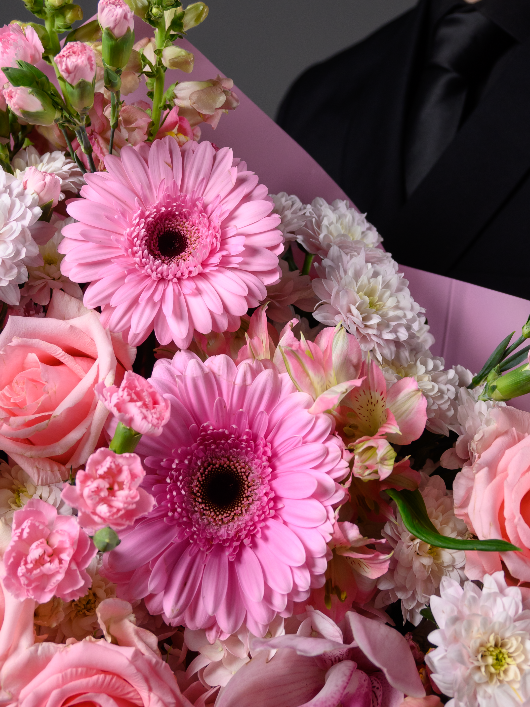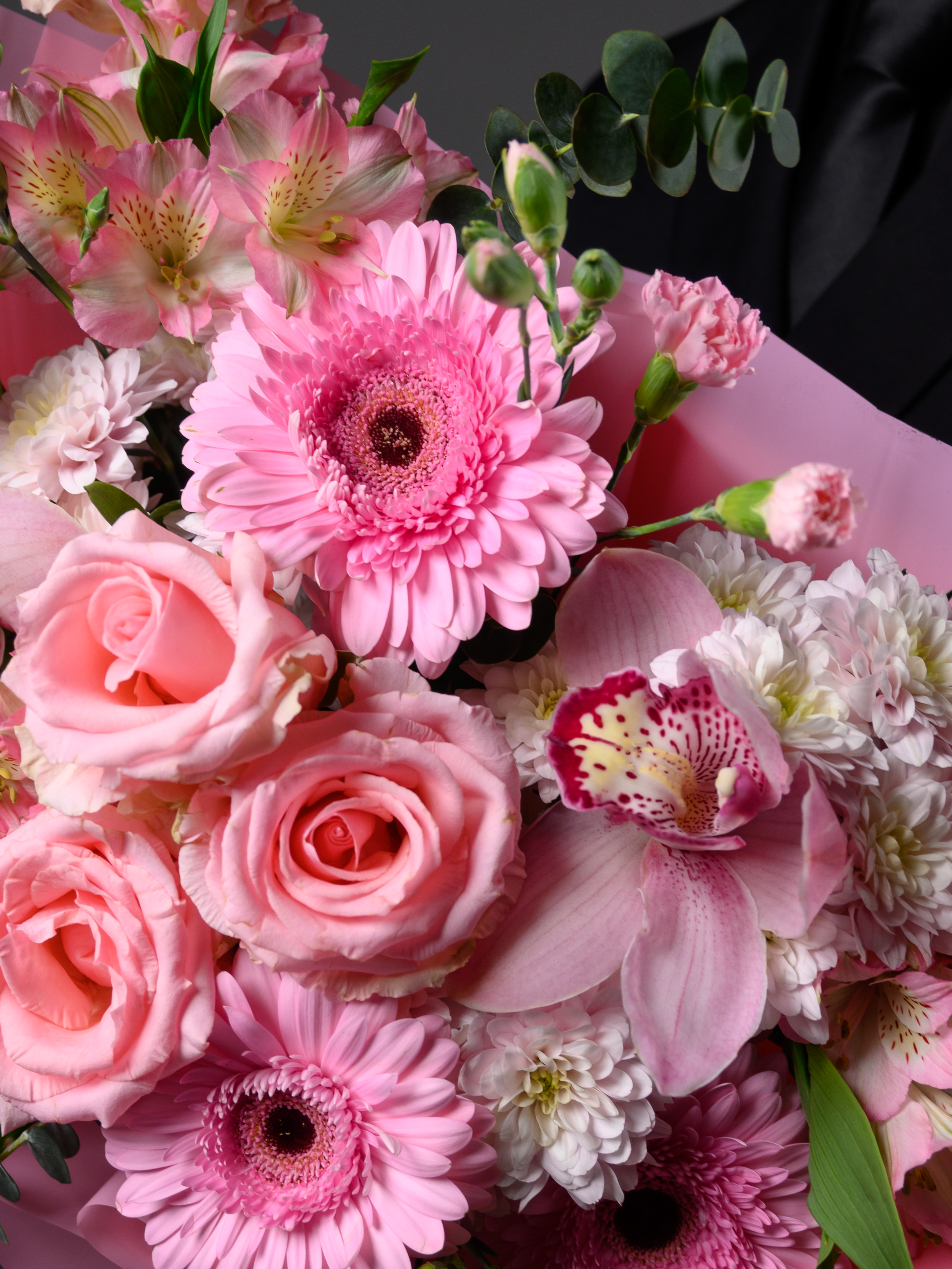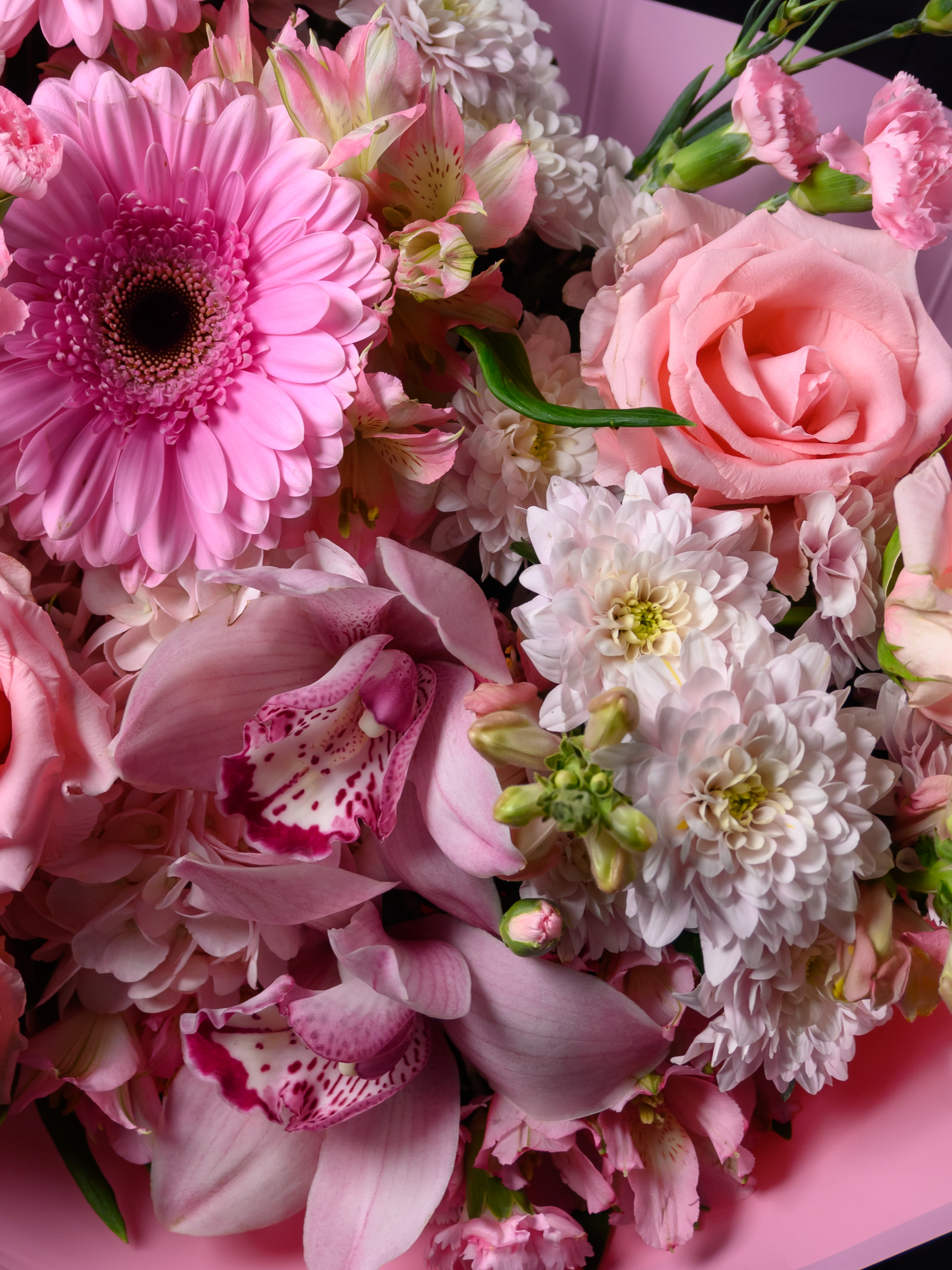 Букет «Улыбка мамы» — яркое проявление заботы и любви! Сочетание роскошных орхидей, нежных альстромерий, изысканных гербер и ярких роз создаст атмосферу тепла и радости. В букете использованы лучшие цветы. Украшение интерьера станет источником позитива надолго. Три варианта размера (М – 30-35см; L – 40-45см; XL – 50-55см) позволят выбрать идеальный букет именно для вашей мамы.